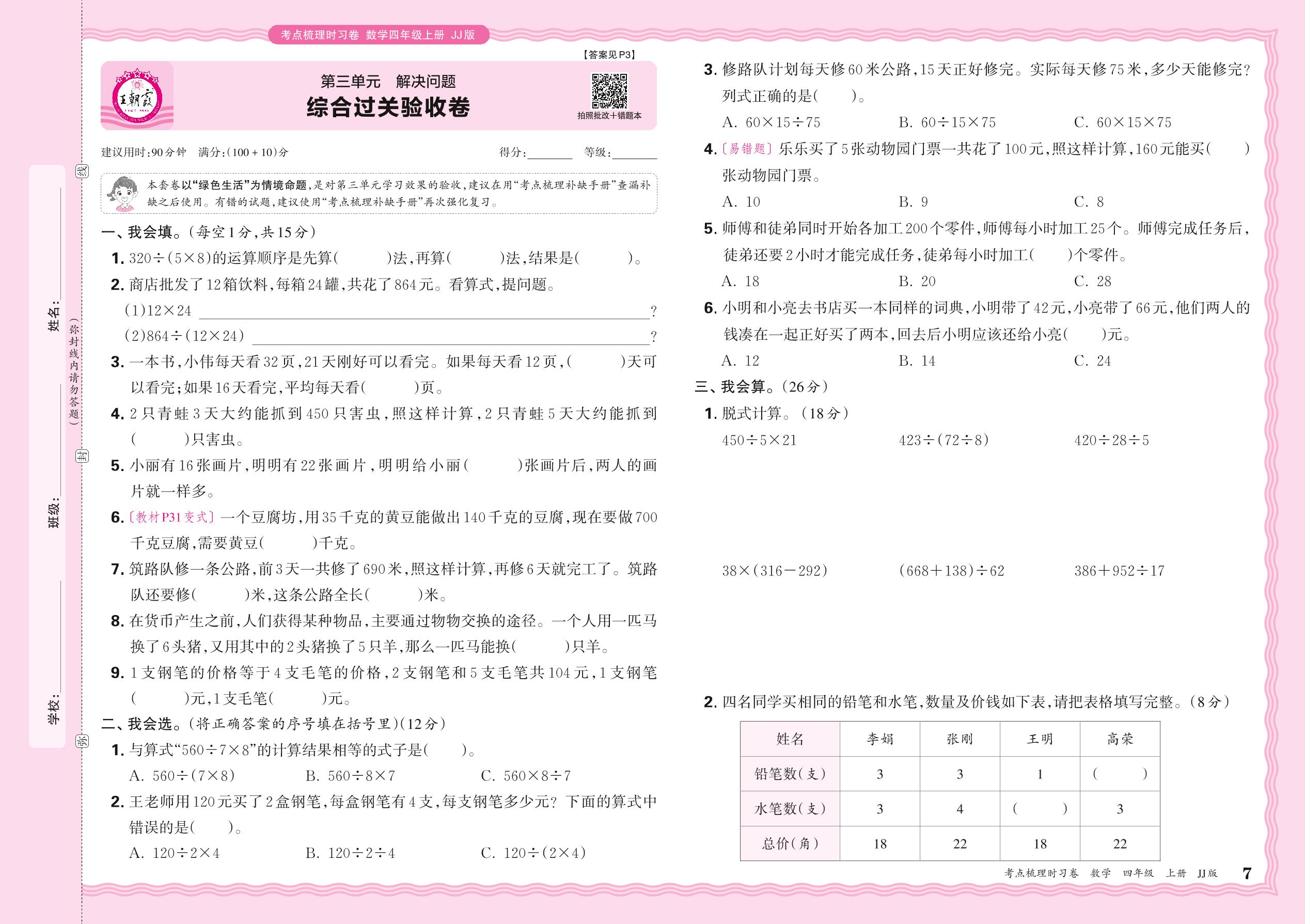 2024秋上册四年级数学冀教版 第三单元 综合过关验收卷