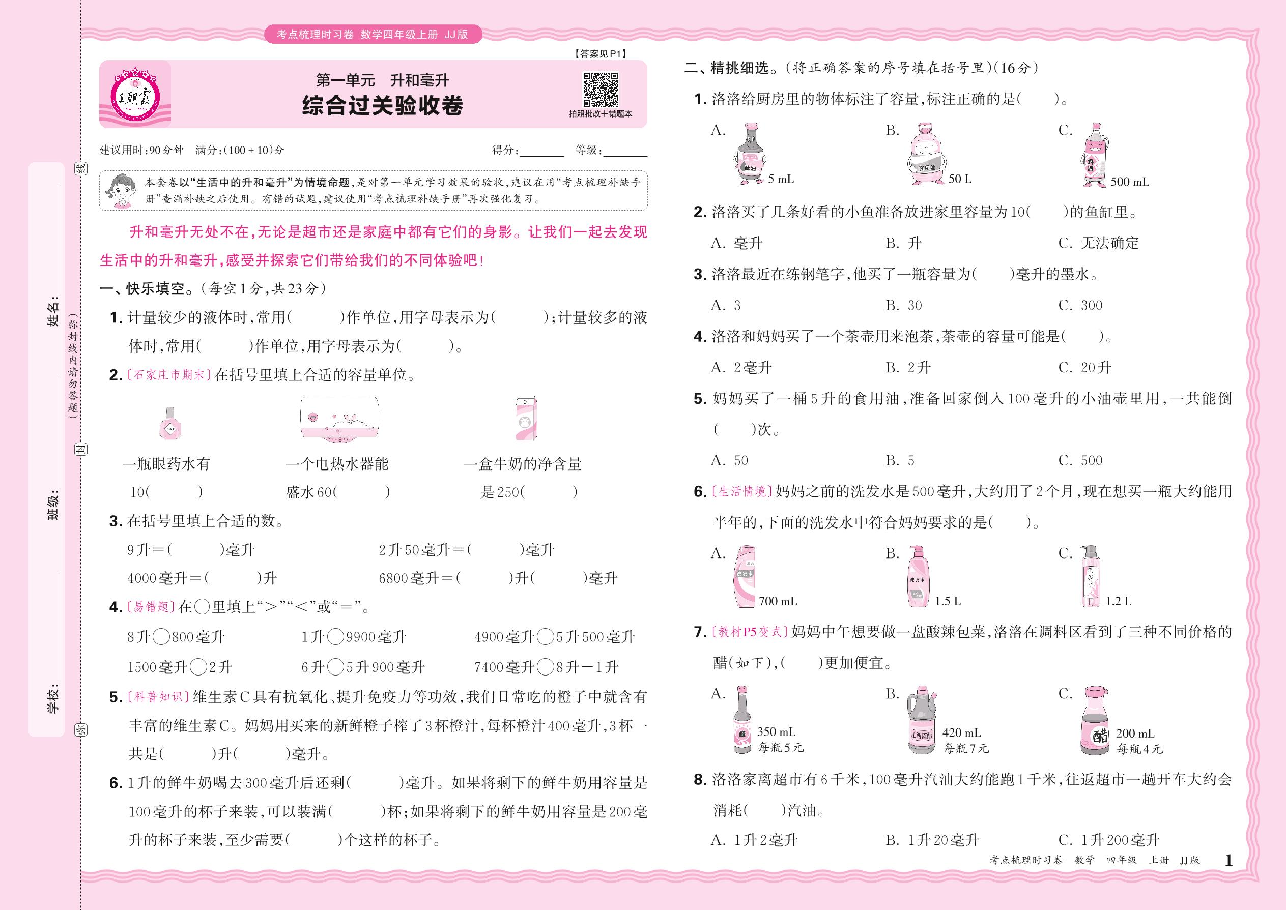 四年级数学冀教版上册单元卷
