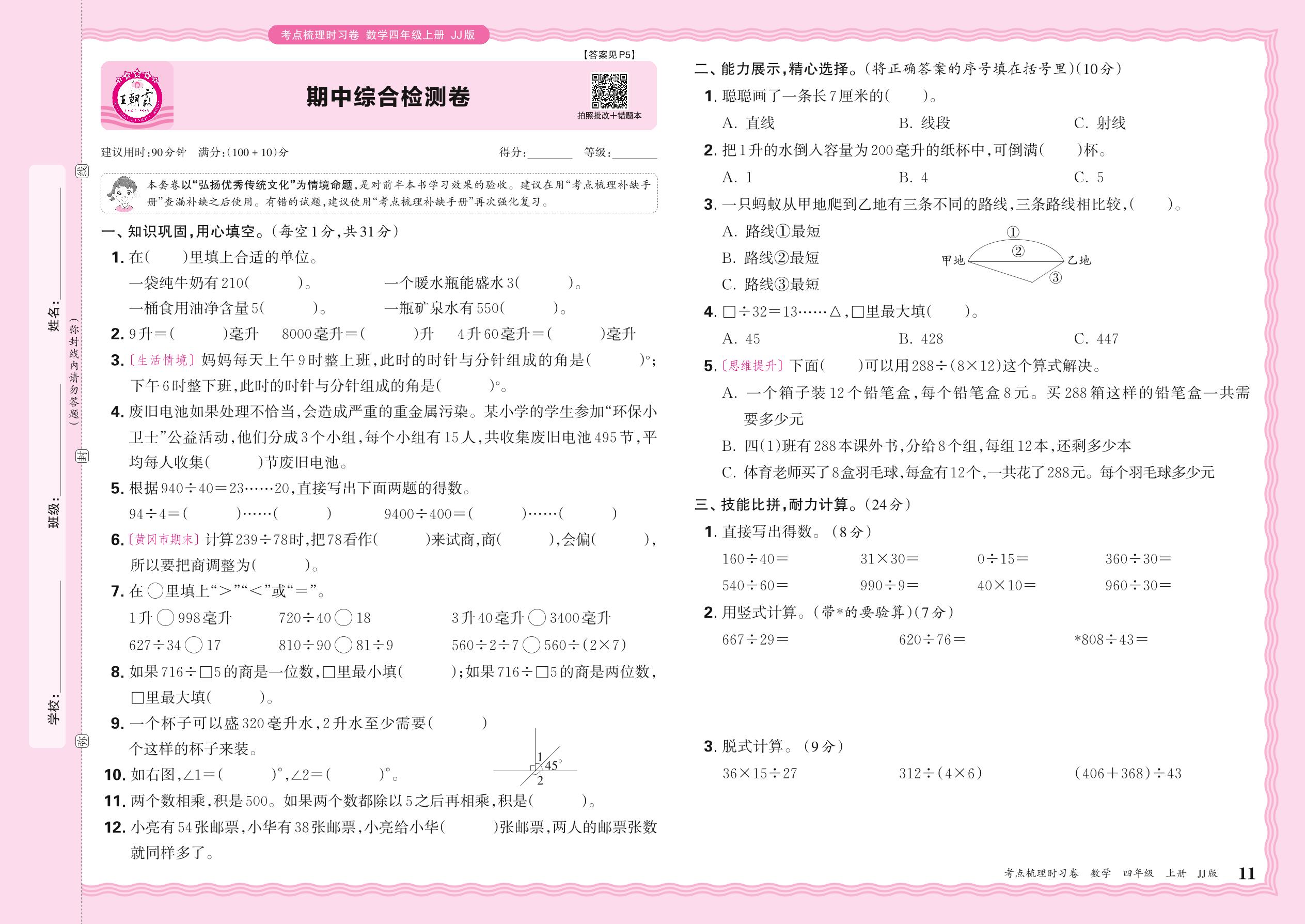 2024秋上册四年级数学冀教版 期中综合检测卷