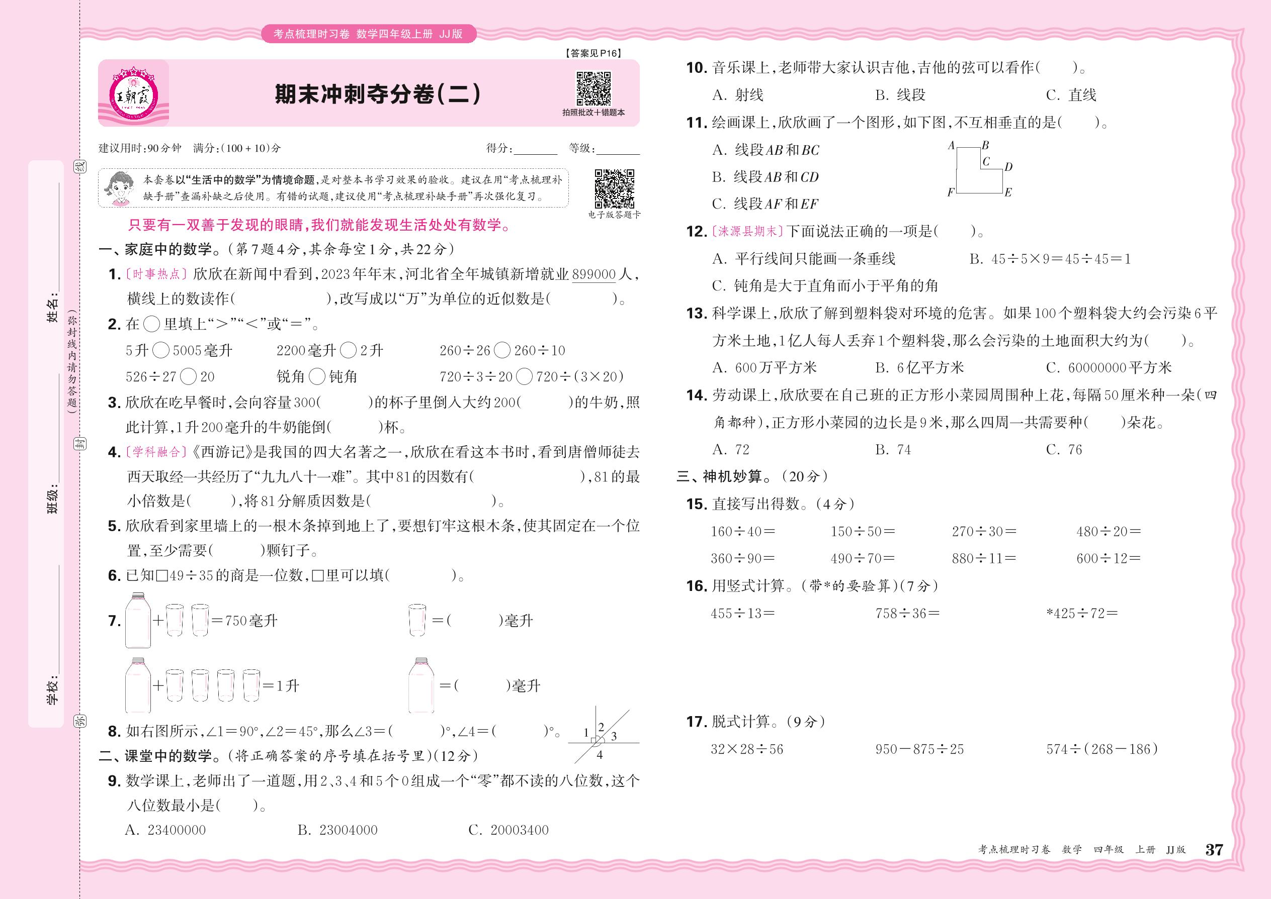 2024秋上册四年级数学冀教版 期末冲刺夺分卷(二)