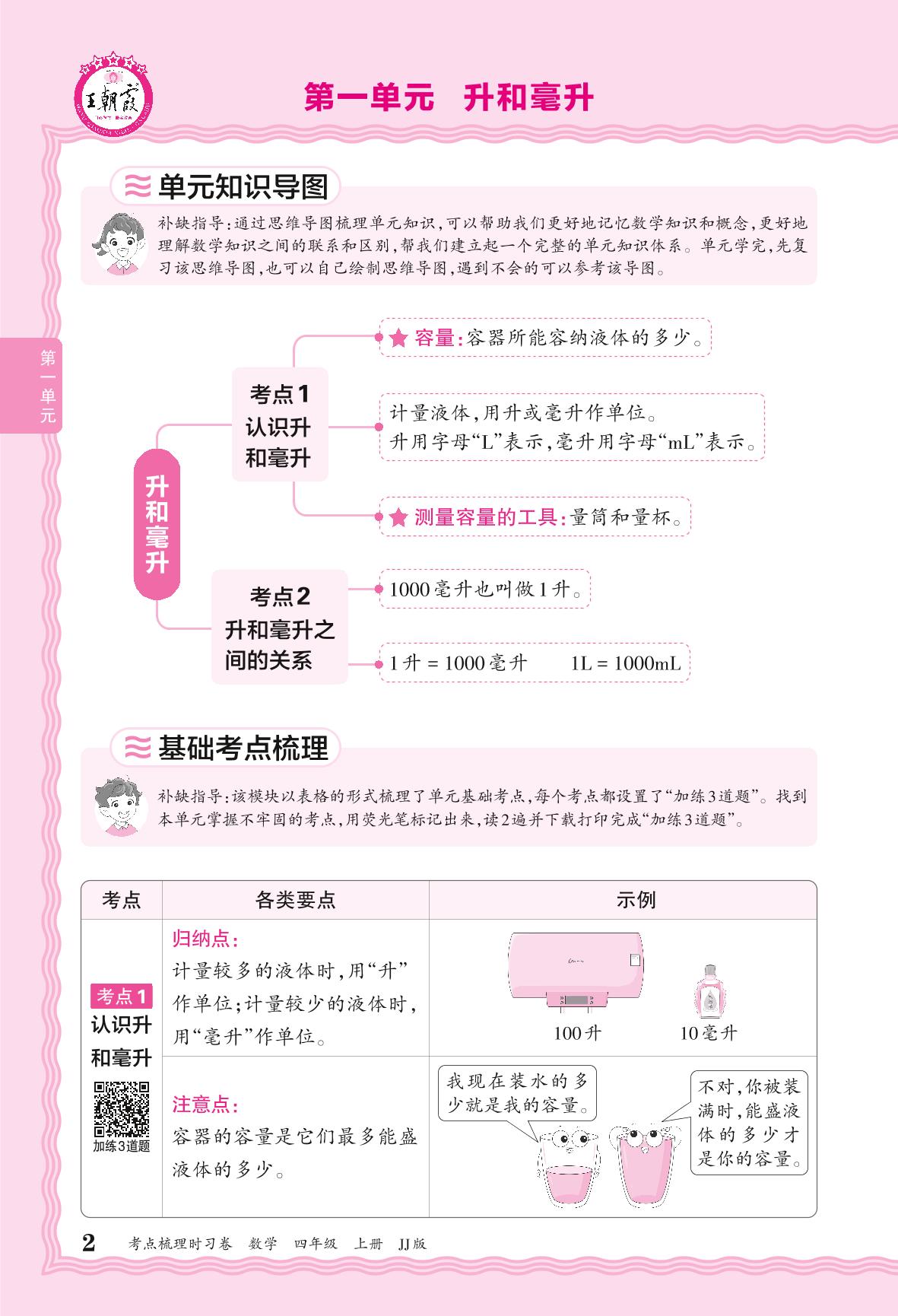 2024秋上册四年级数学冀教版 考点梳理补缺手册——第一单元 升和毫升