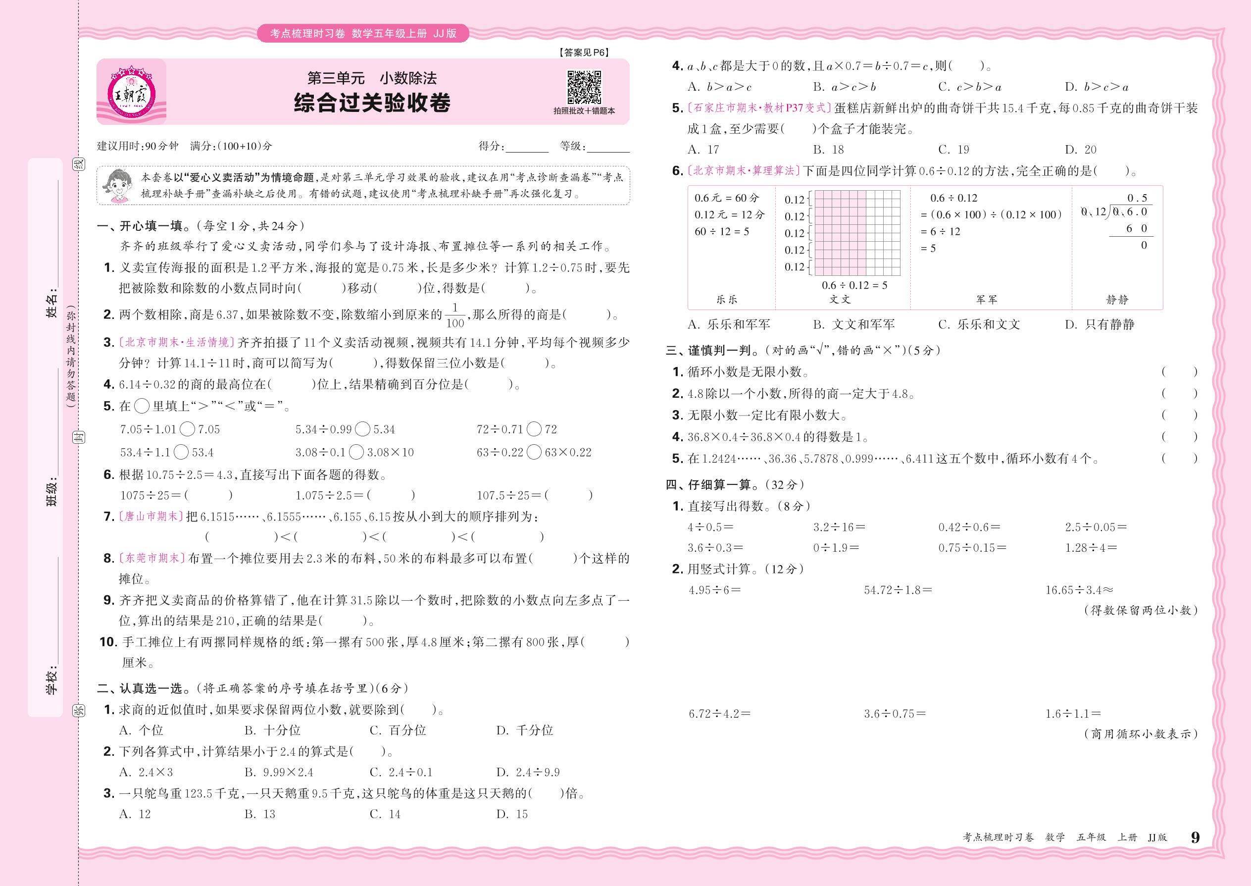 2024秋上册五年级数学冀教版 第三单元 综合过关验收卷