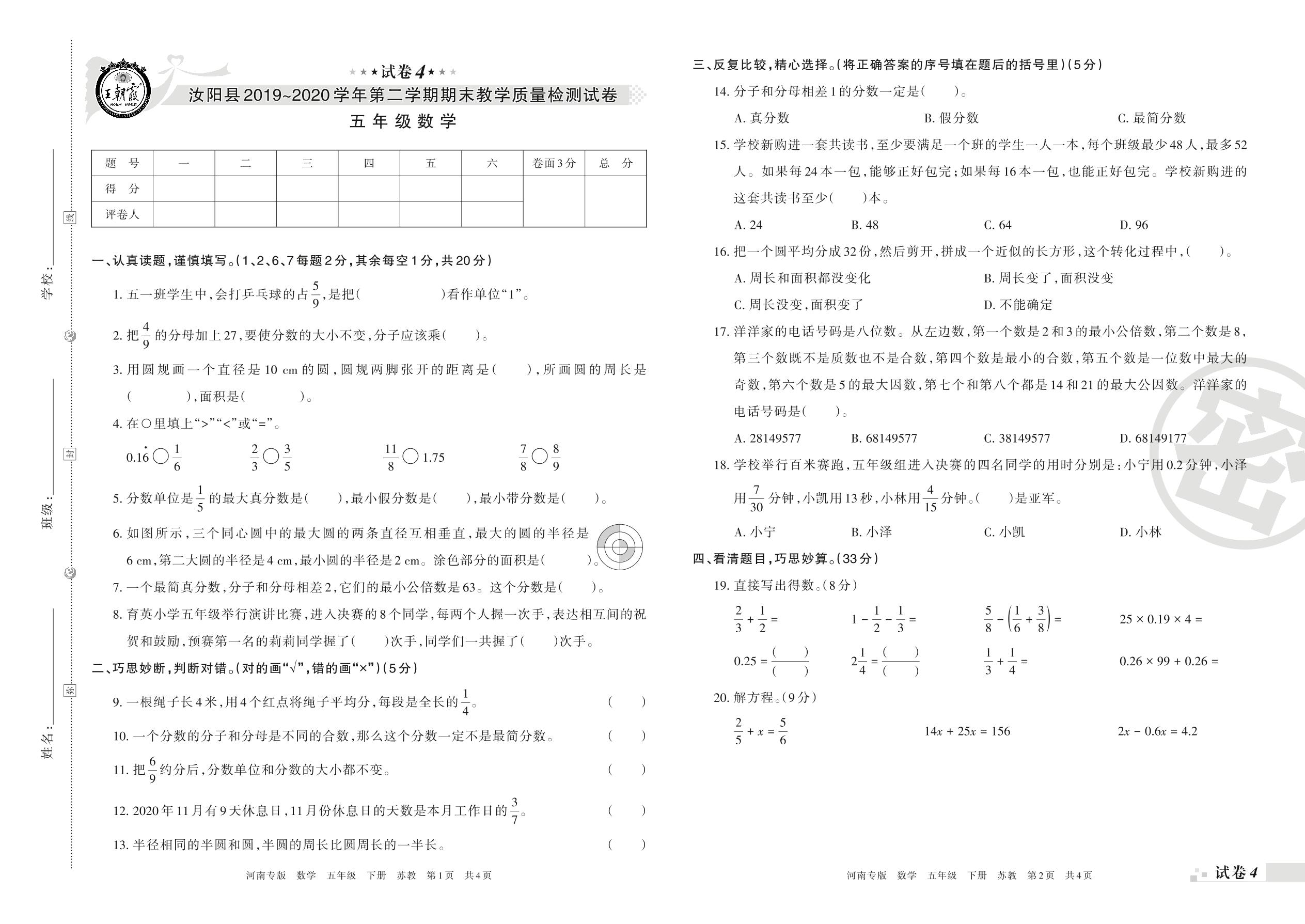2019-2020学年第二学期洛阳市汝阳县五年级数学试卷(苏教版)【4】