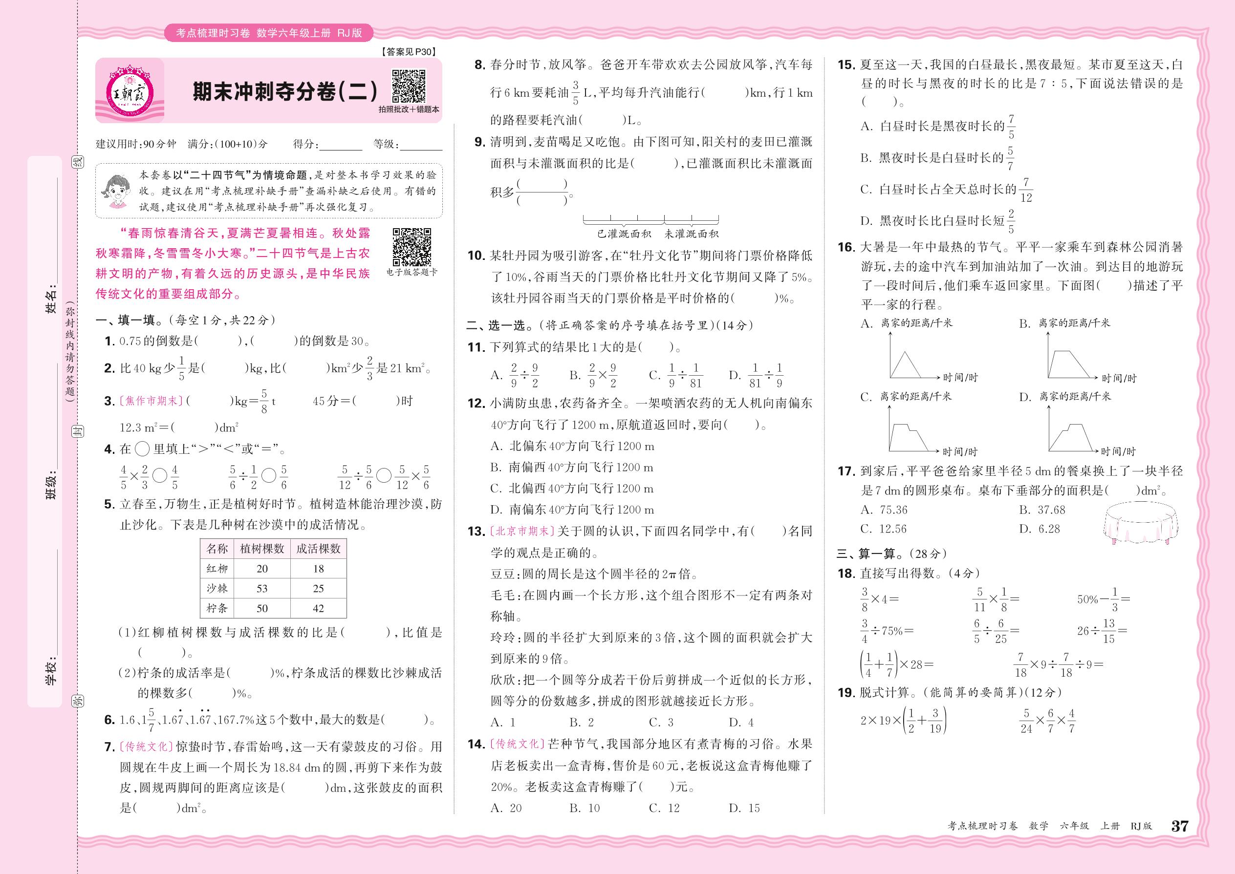 2024秋上册六年级数学人教版 期末冲刺夺分卷(二)
