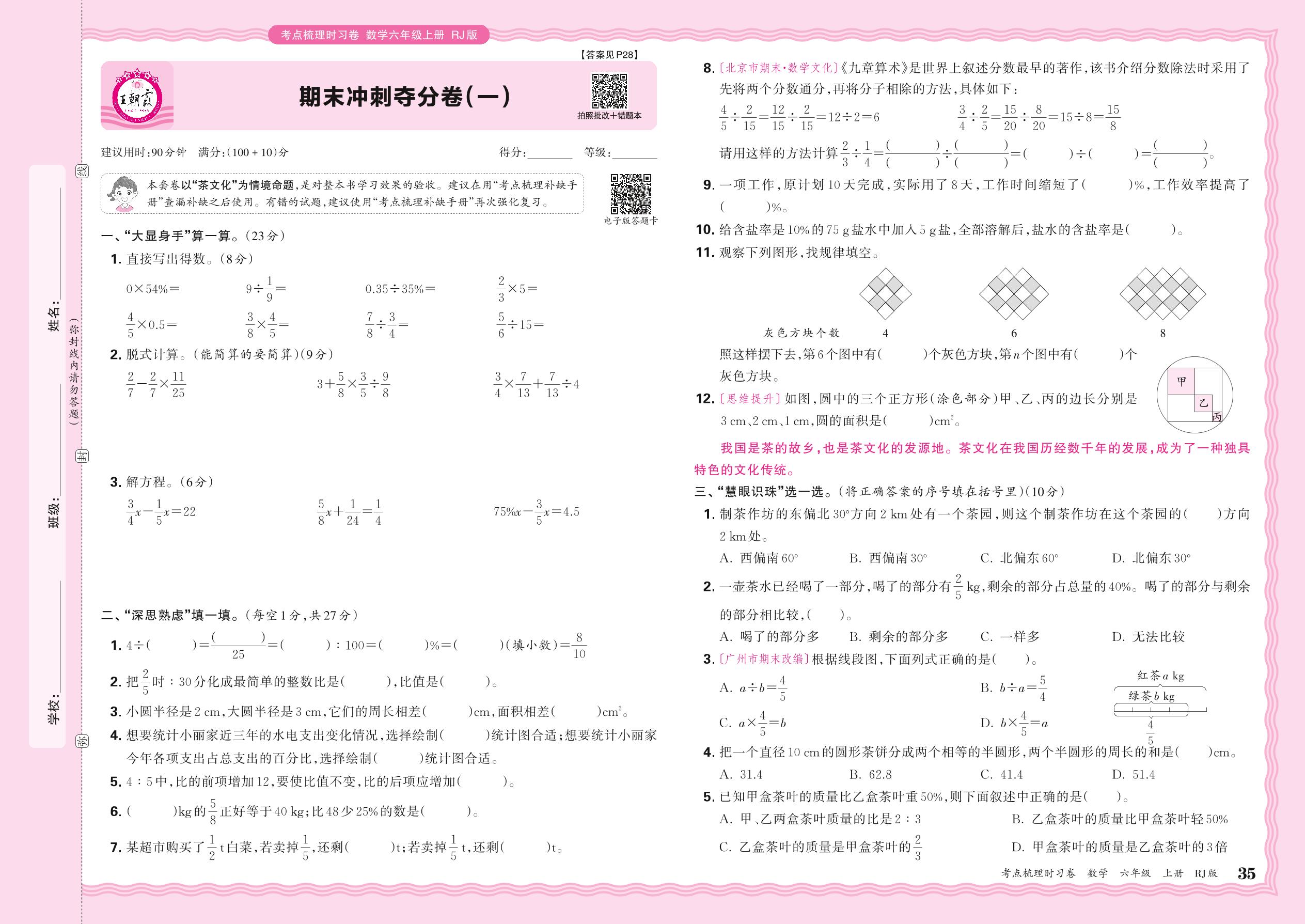 2024秋上册六年级数学人教版 期末冲刺夺分卷(一)