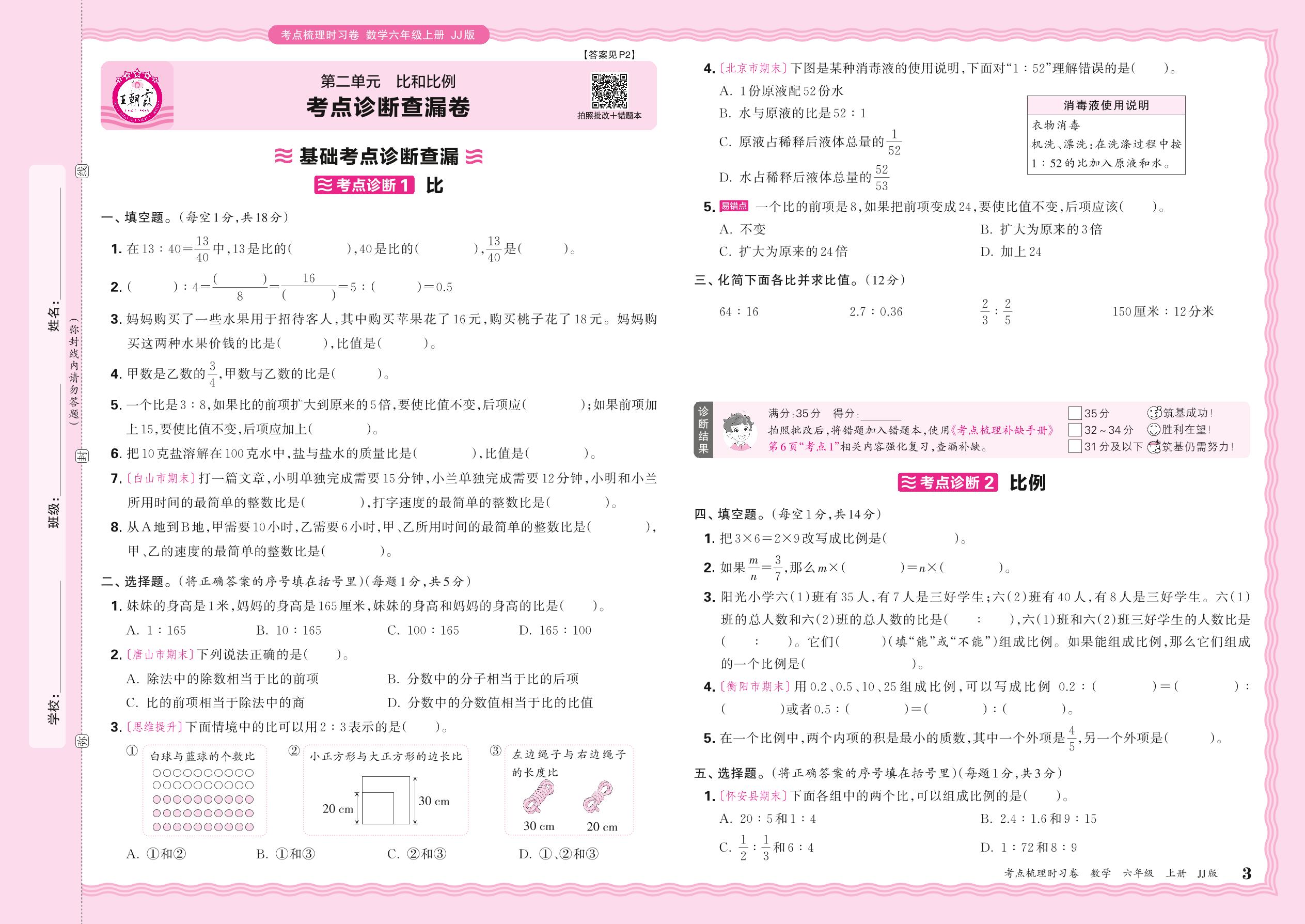 2024秋上册六年级数学冀教版 第二单元 考点诊断查漏卷