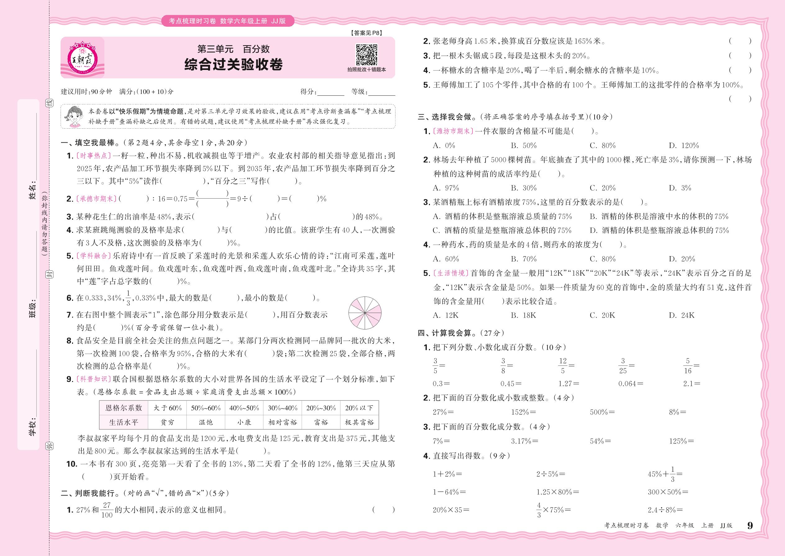 2024秋上册六年级数学冀教版 第三单元 综合过关验收卷