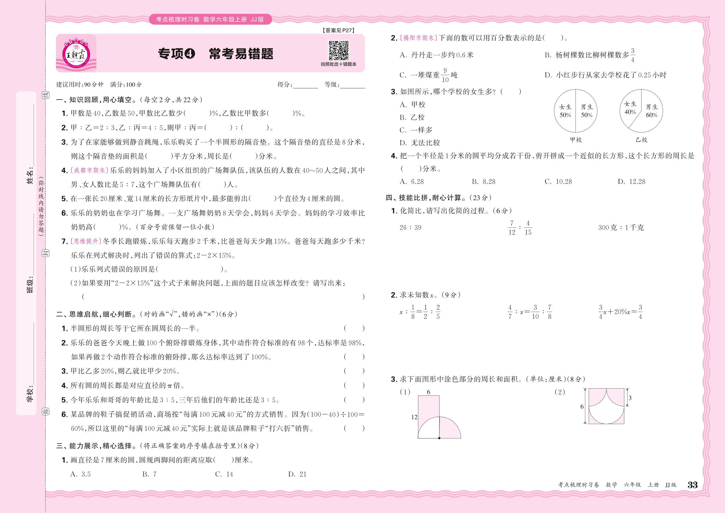 2024秋上册六年级数学冀教版 期末专项卷KD版·常考易错题【4】