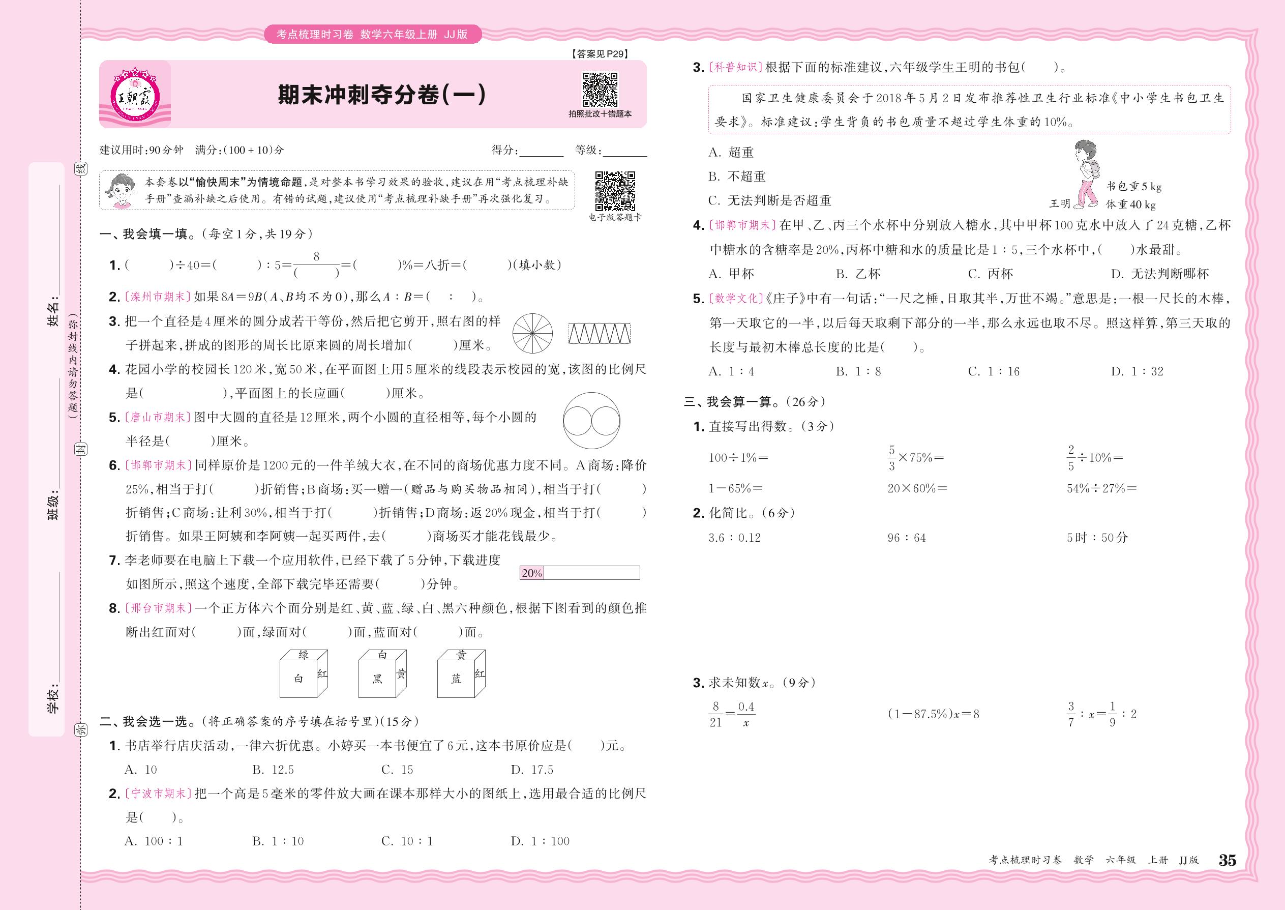 2024秋上册六年级数学冀教版 期末冲刺夺分卷(一)