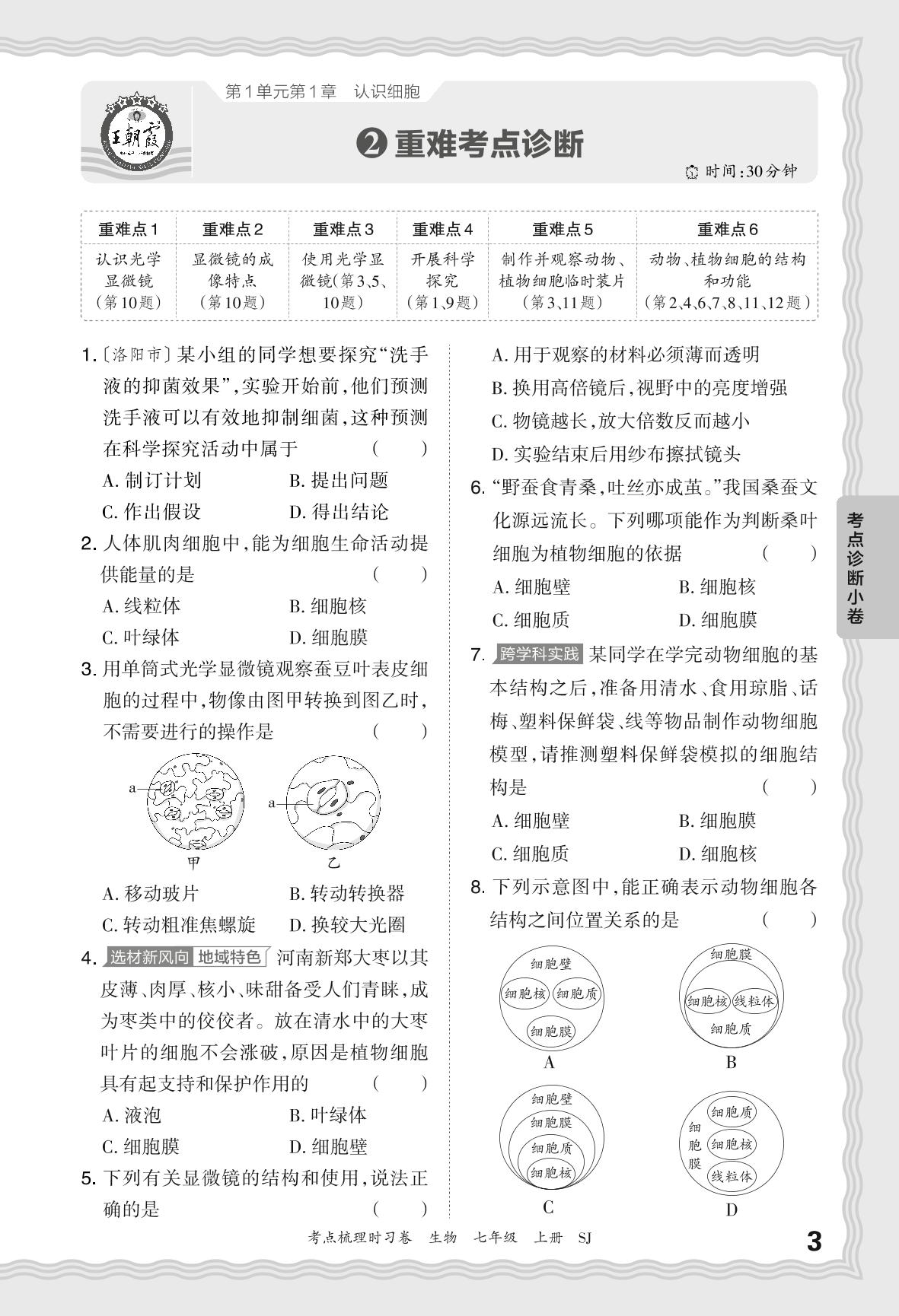 2024秋上册七年级生物苏教版 第1单元第1章 重难考点诊断