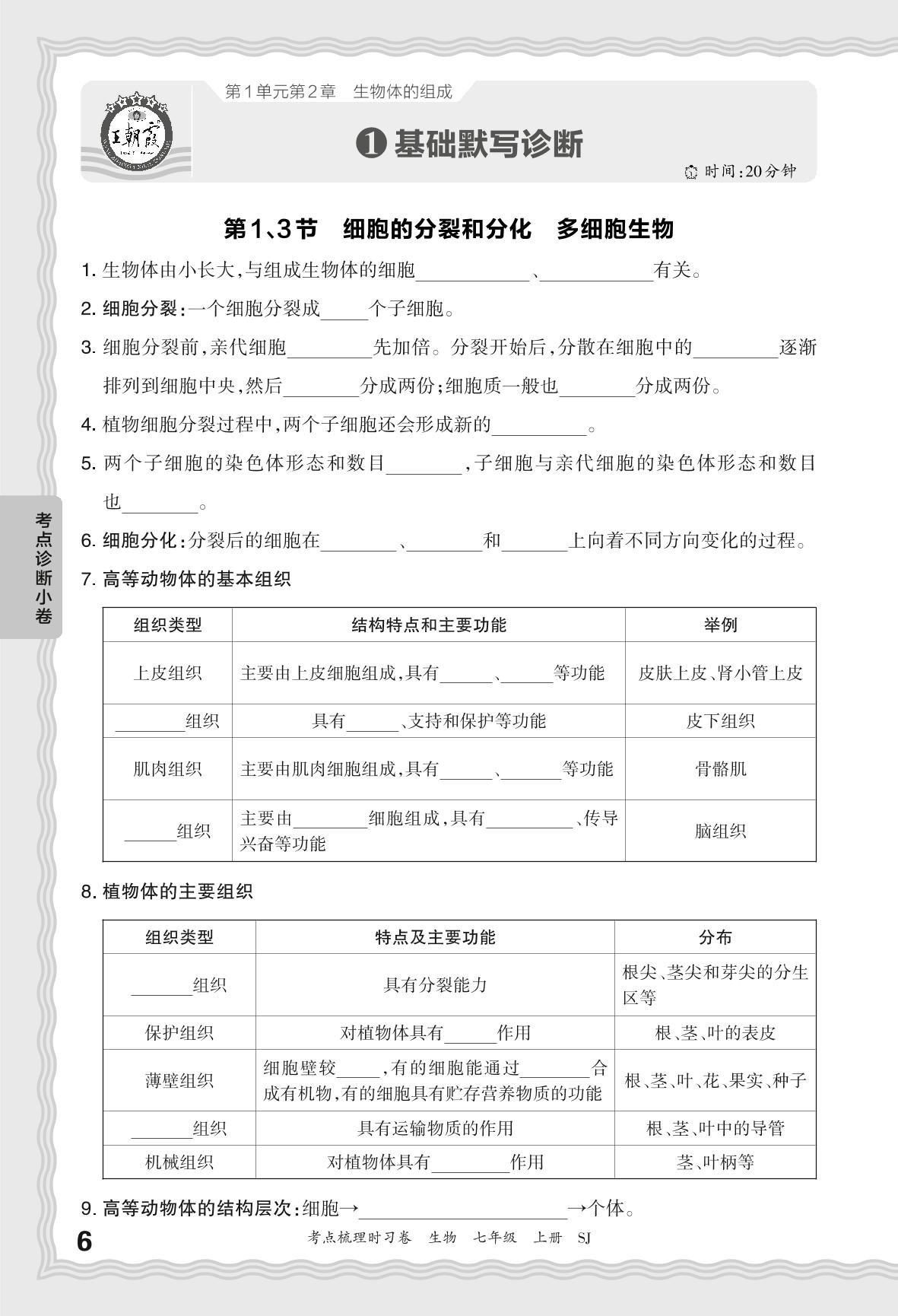 2024秋上册七年级生物苏教版 第1单元第2章 基础默写诊断