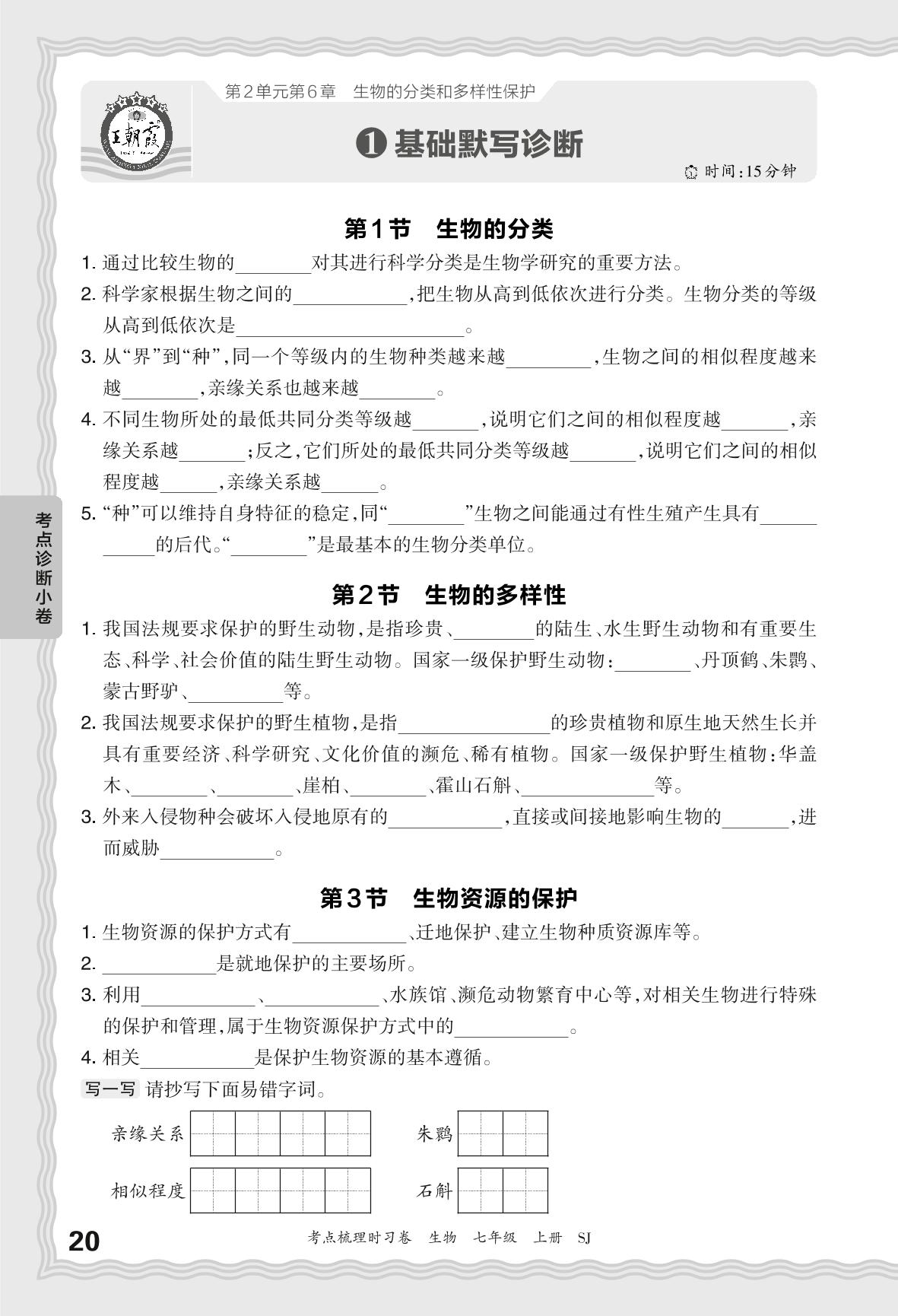 2024秋上册七年级生物苏教版 第2单元第6章 基础默写诊断