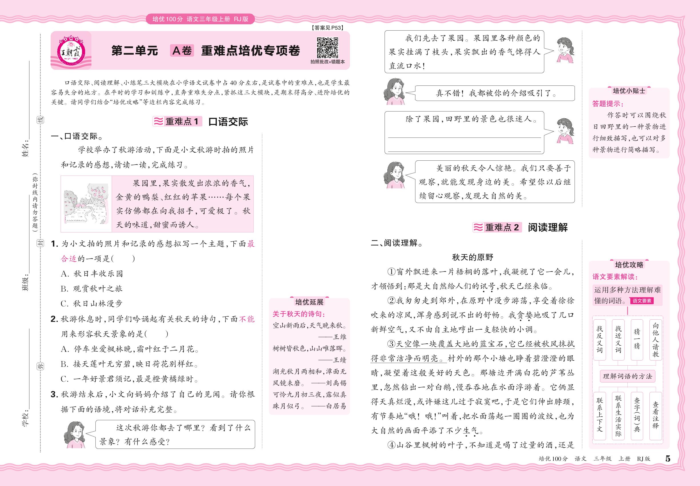 2024秋上册三年级语文人教版 第二单元A卷 重难点培优专项卷