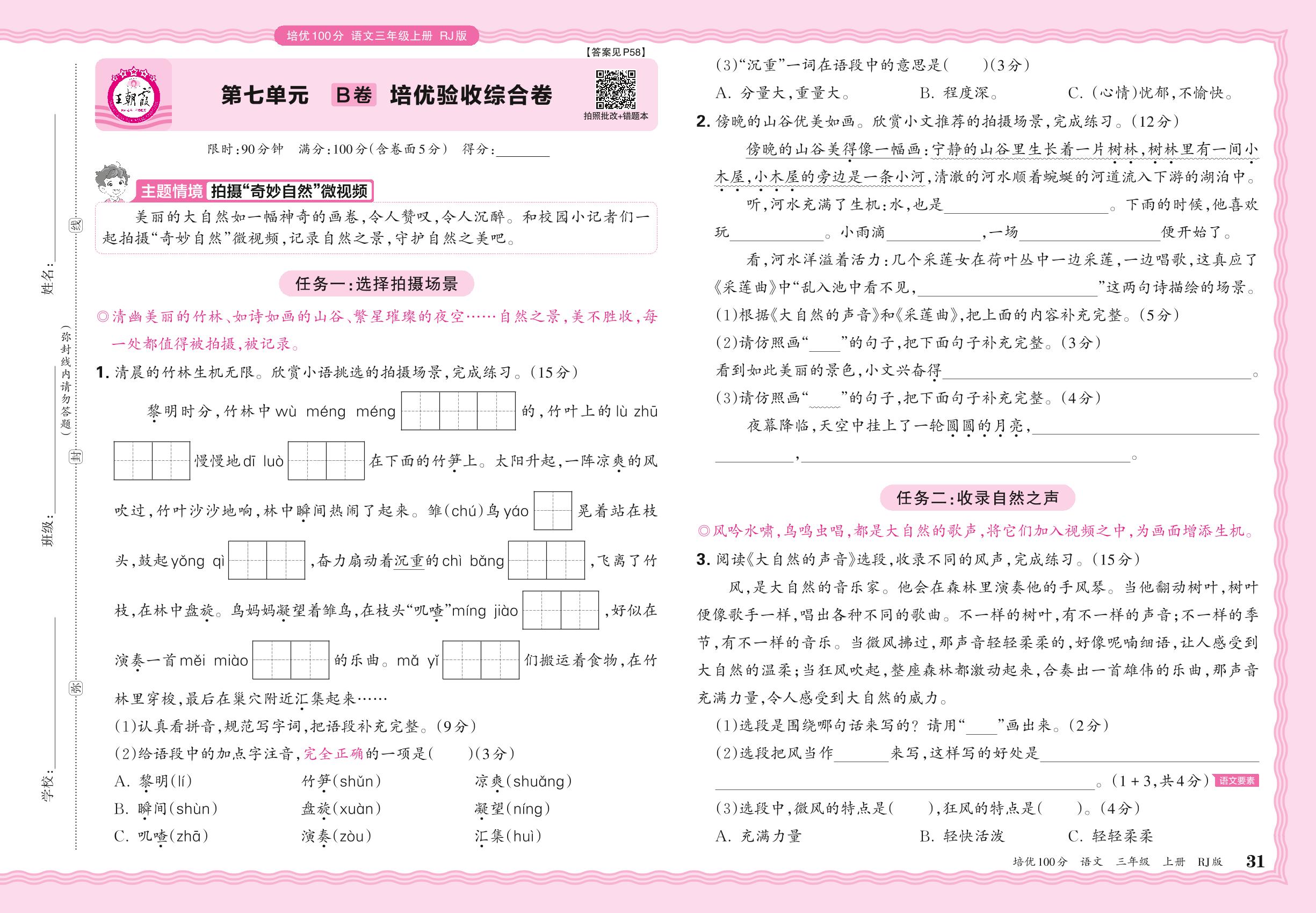 2024秋上册三年级语文人教版 第七单元B卷 培优验收综合卷