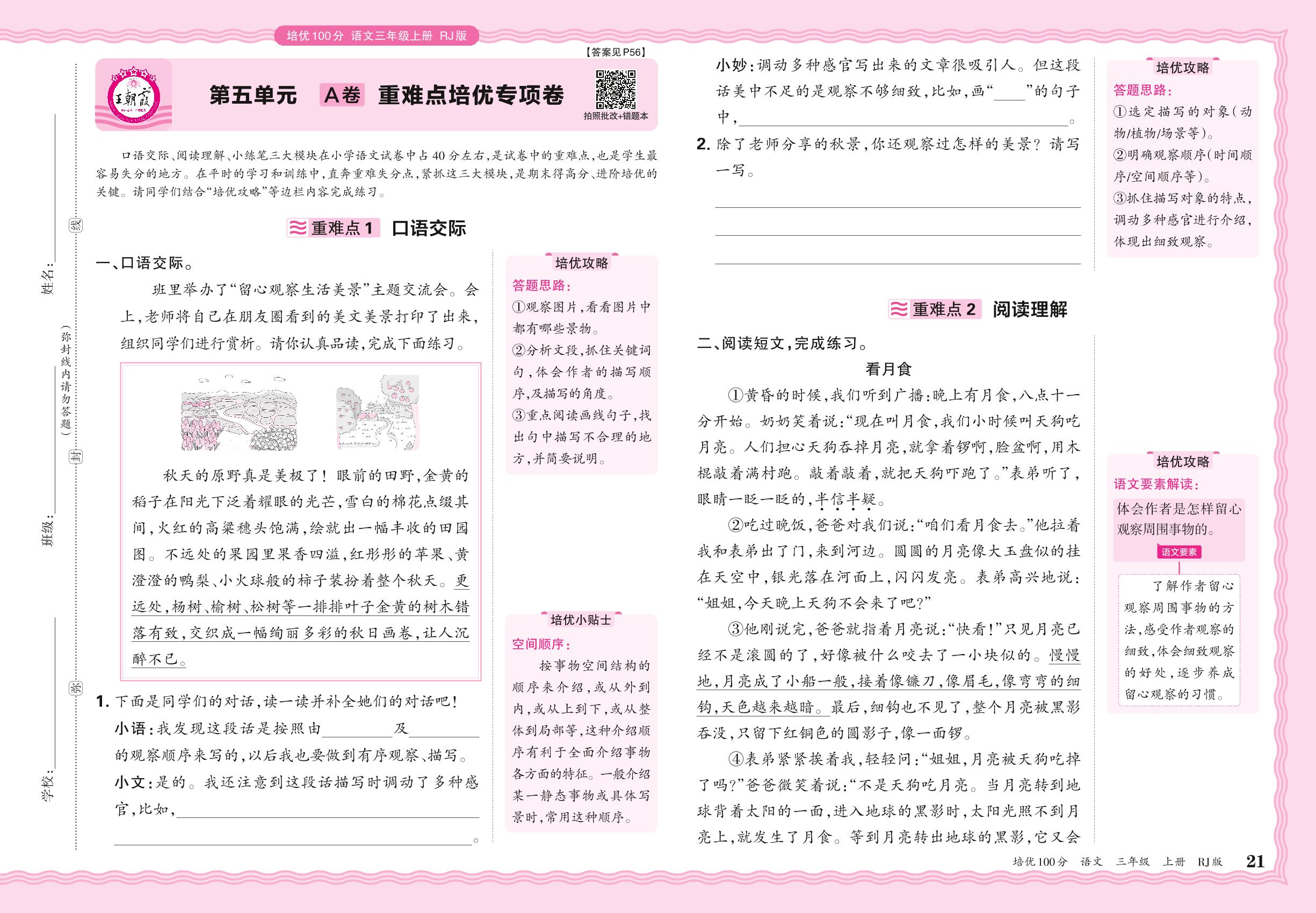 2024秋上册三年级语文人教版 第五单元A卷 重难点培优专项卷