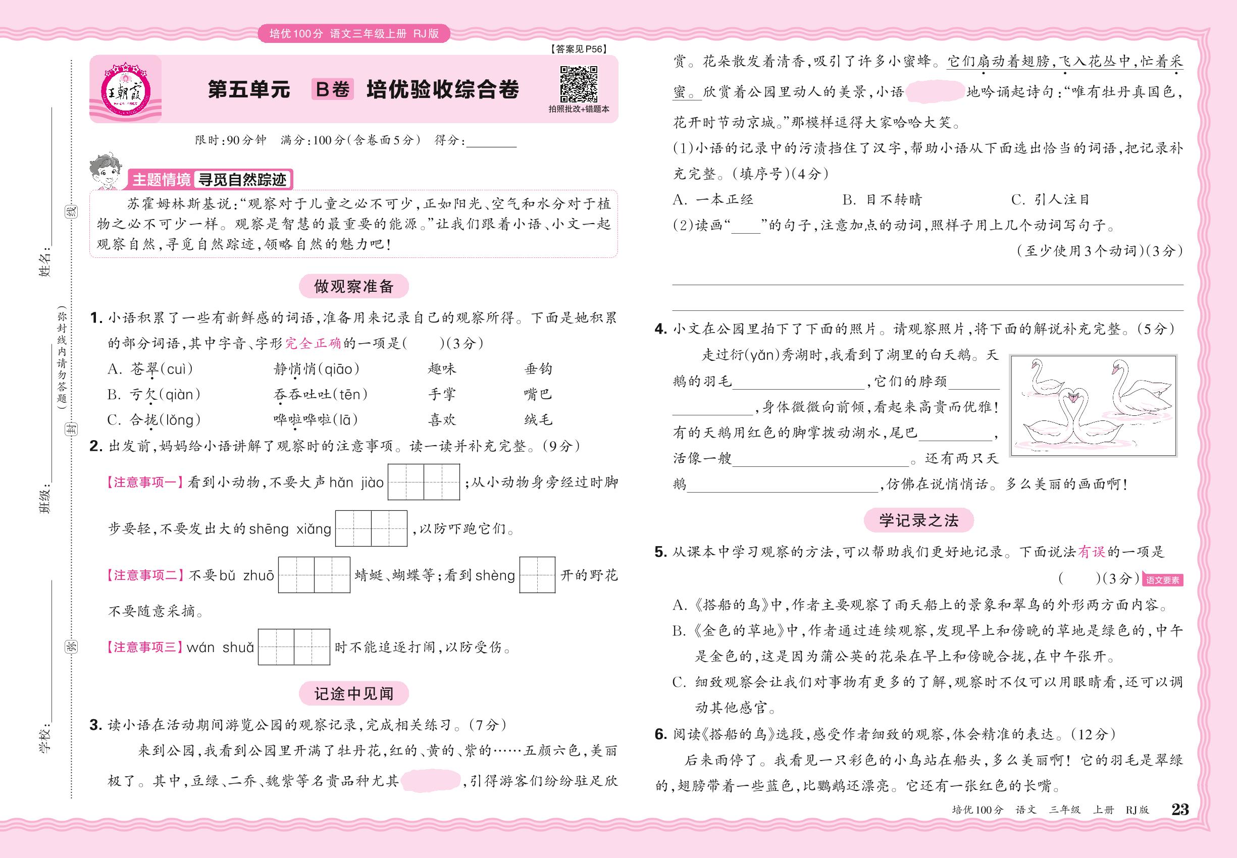 2024秋上册三年级语文人教版 第五单元B卷 培优验收综合卷