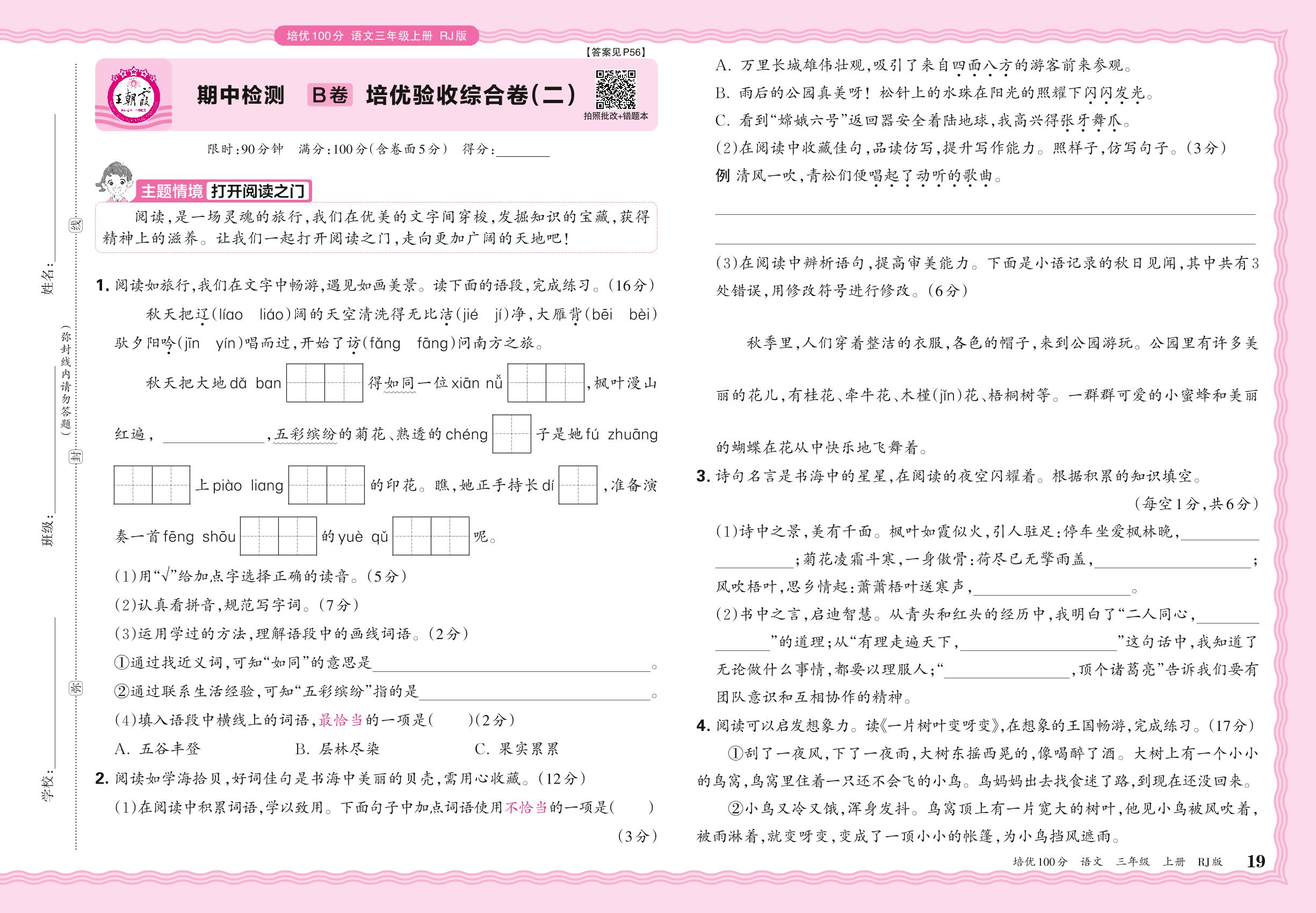 2024秋上册三年级语文人教版 期中检测B卷 培优验收综合卷(二)