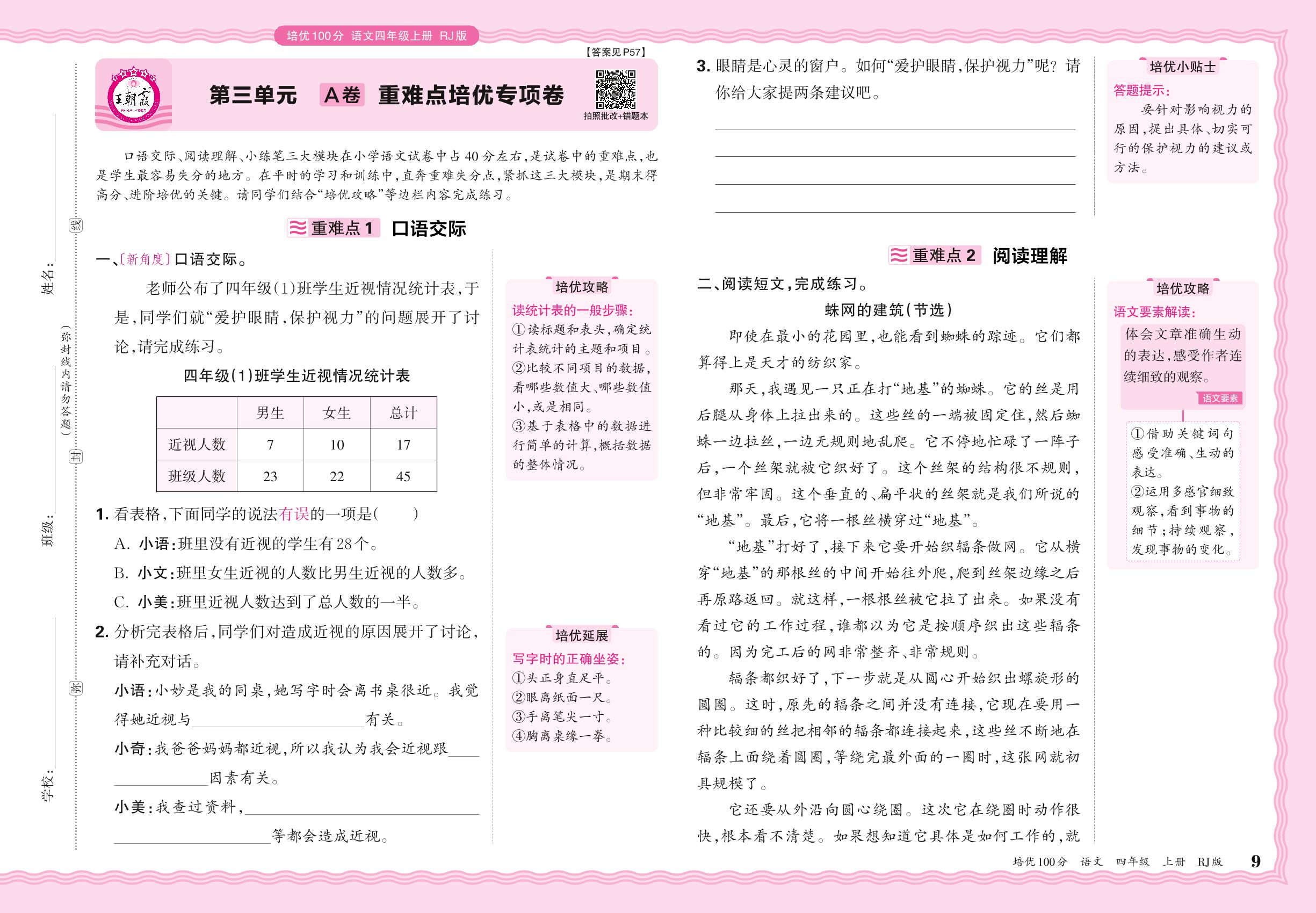2024秋上册四年级语文人教版 第三单元A卷 重难点培优专项卷