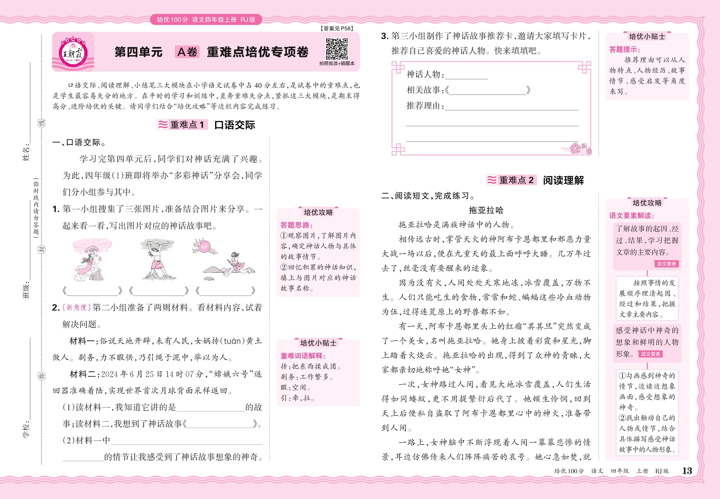 2024秋上册四年级语文人教版 第四单元A卷 重难点培优专项卷