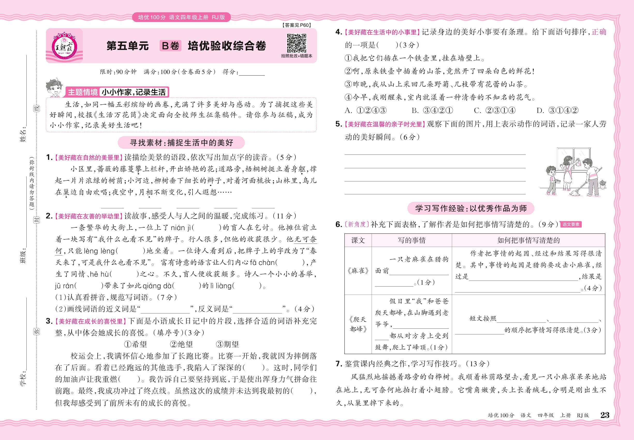 2024秋上册四年级语文人教版 第五单元B卷 培优验收综合卷