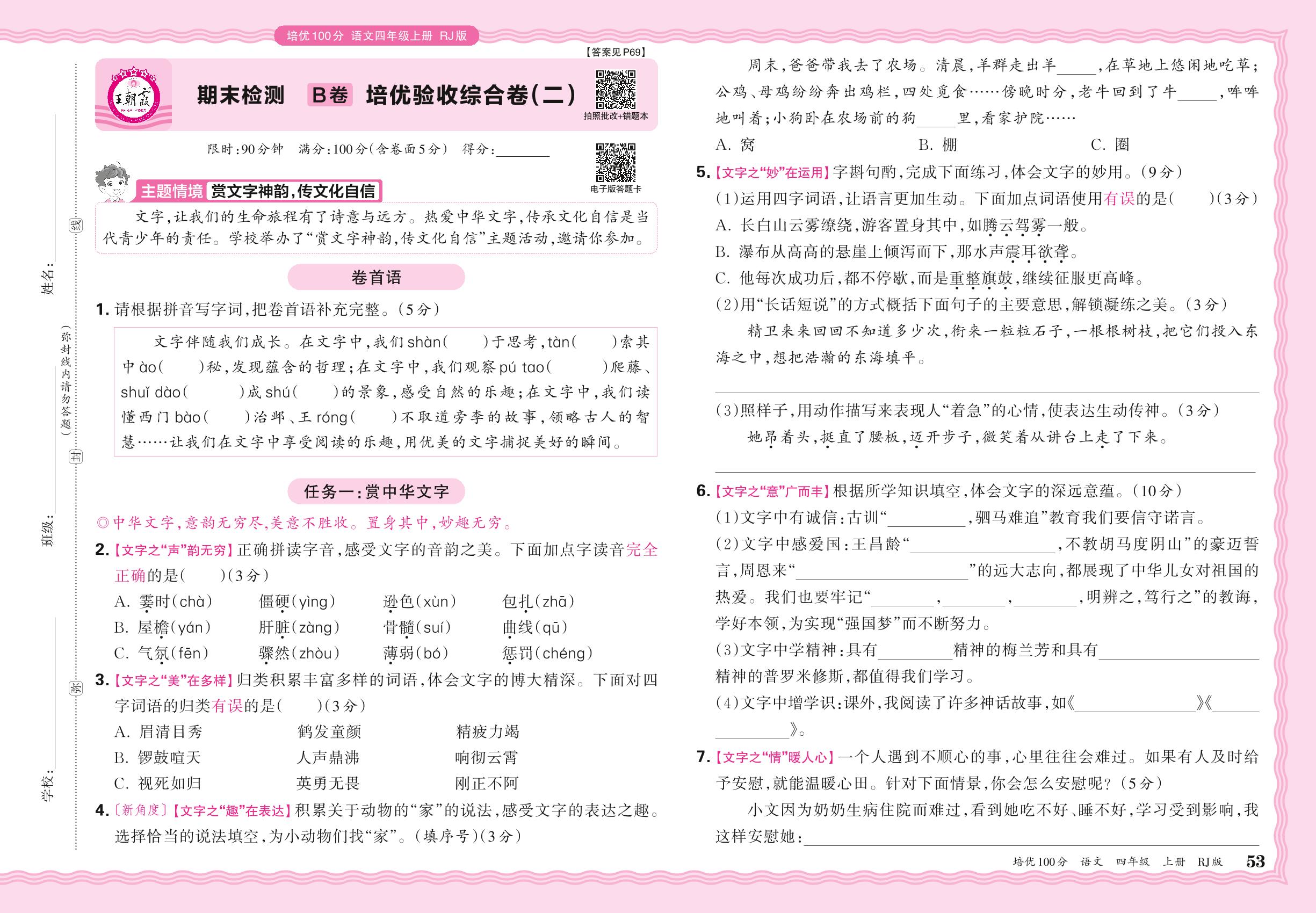 2024秋上册四年级语文人教版 期末检测B卷 培优验收综合卷(二)