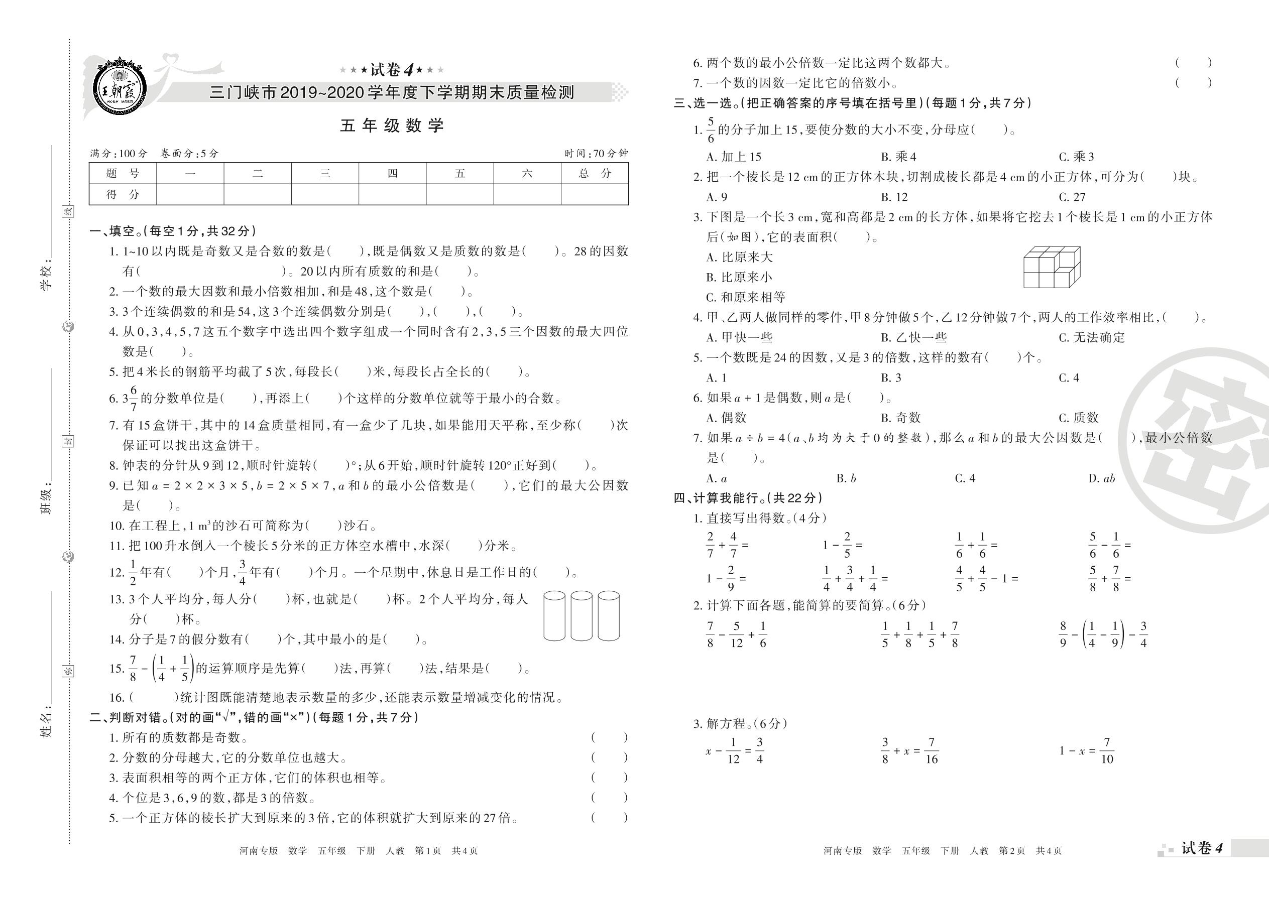 2019-2020学年第二学期三门峡市五年级数学试卷(人教版)【4】