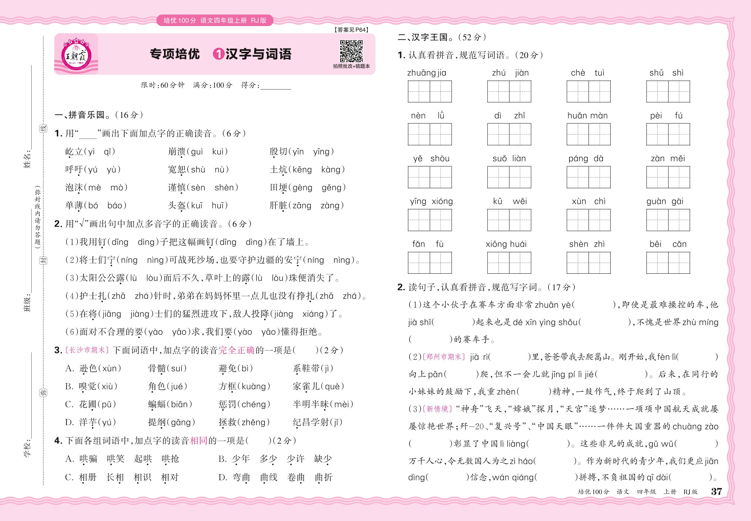 2024秋上册四年级语文人教版 期末专项卷PY版·汉字与词语【1】