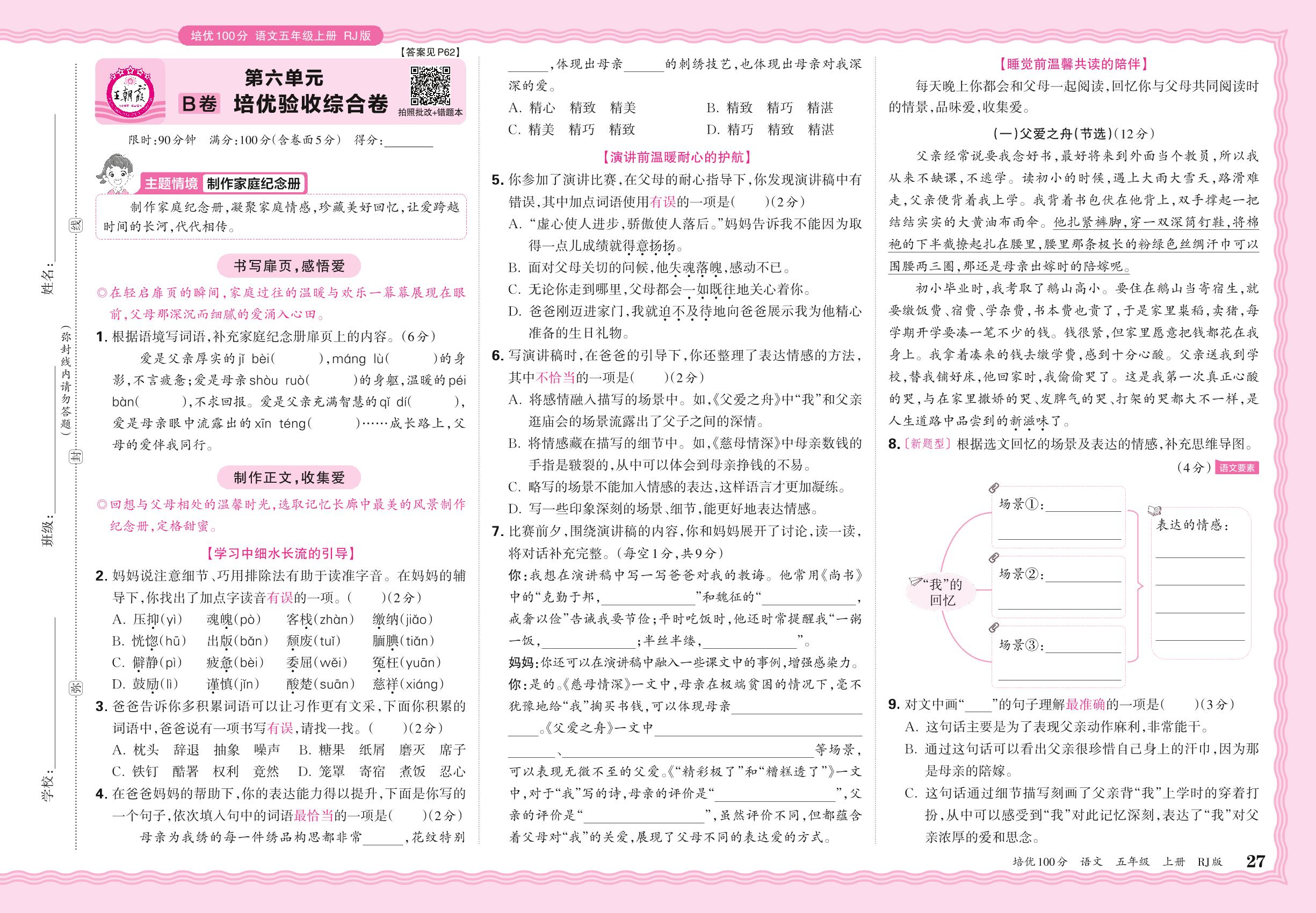 2024秋上册五年级语文人教版 第六单元B卷 培优验收综合卷