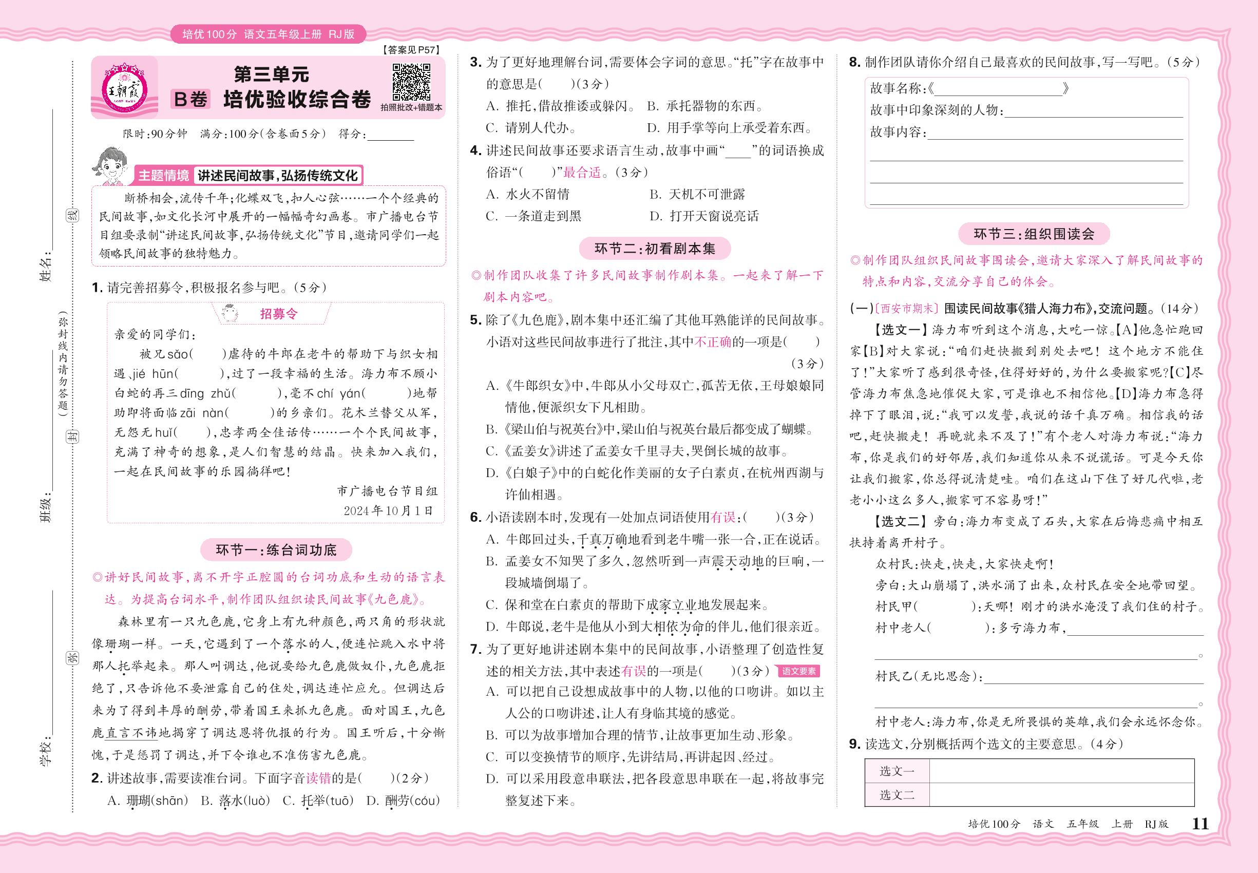 2024秋上册五年级语文人教版 第三单元B卷 培优验收综合卷