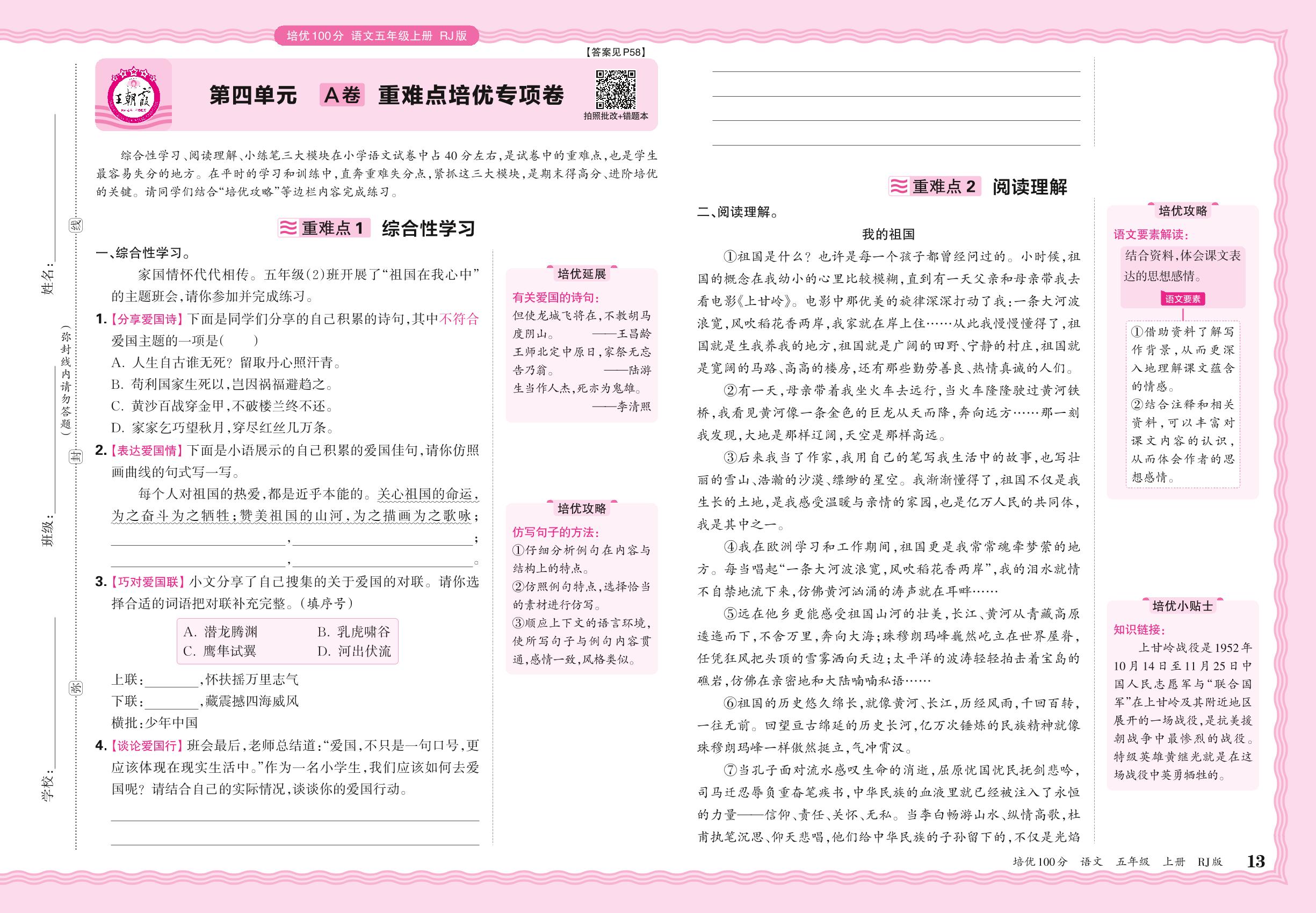 2024秋上册五年级语文人教版 第四单元A卷 重难点培优专项卷