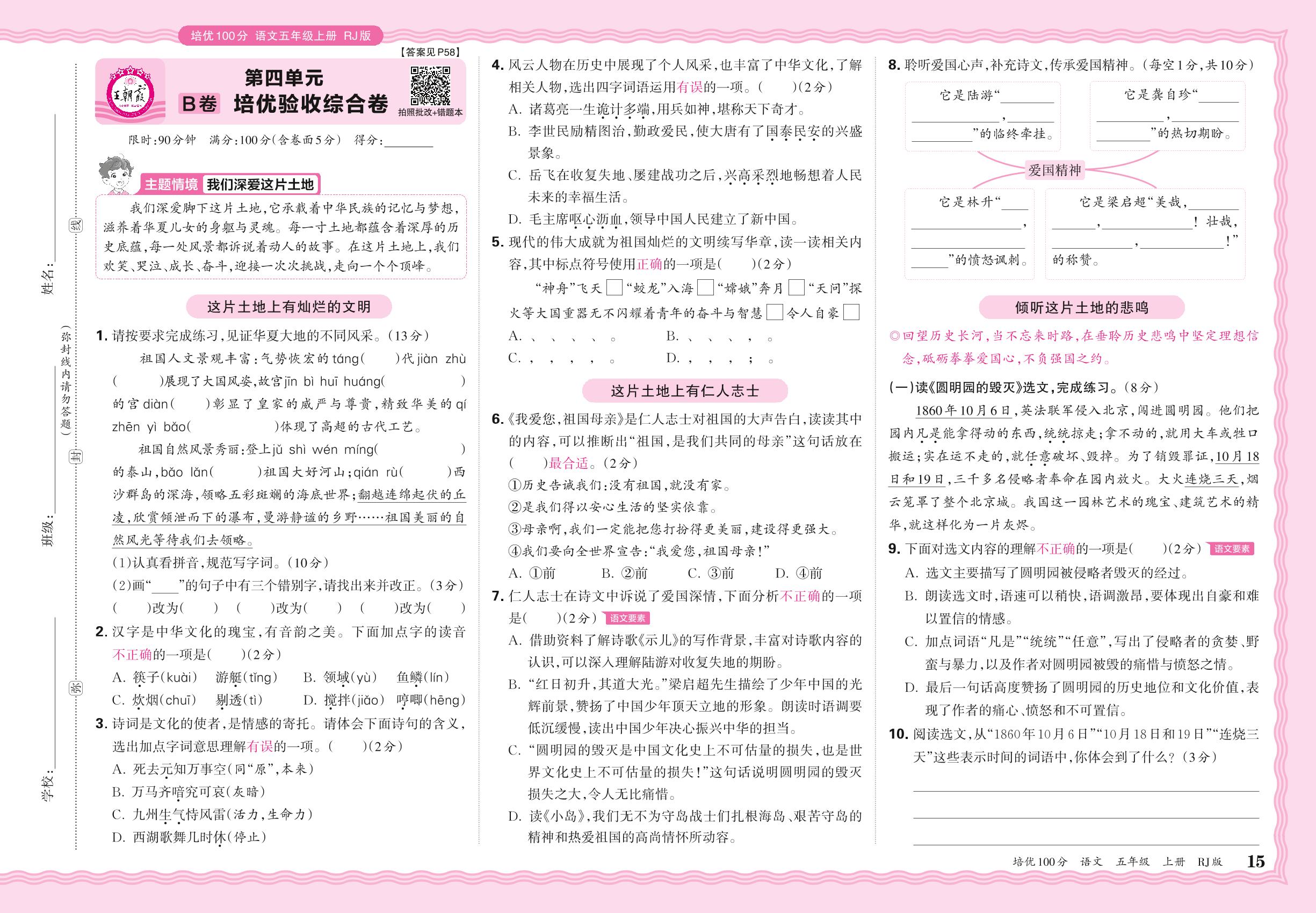 2024秋上册五年级语文人教版 第四单元B卷 培优验收综合卷
