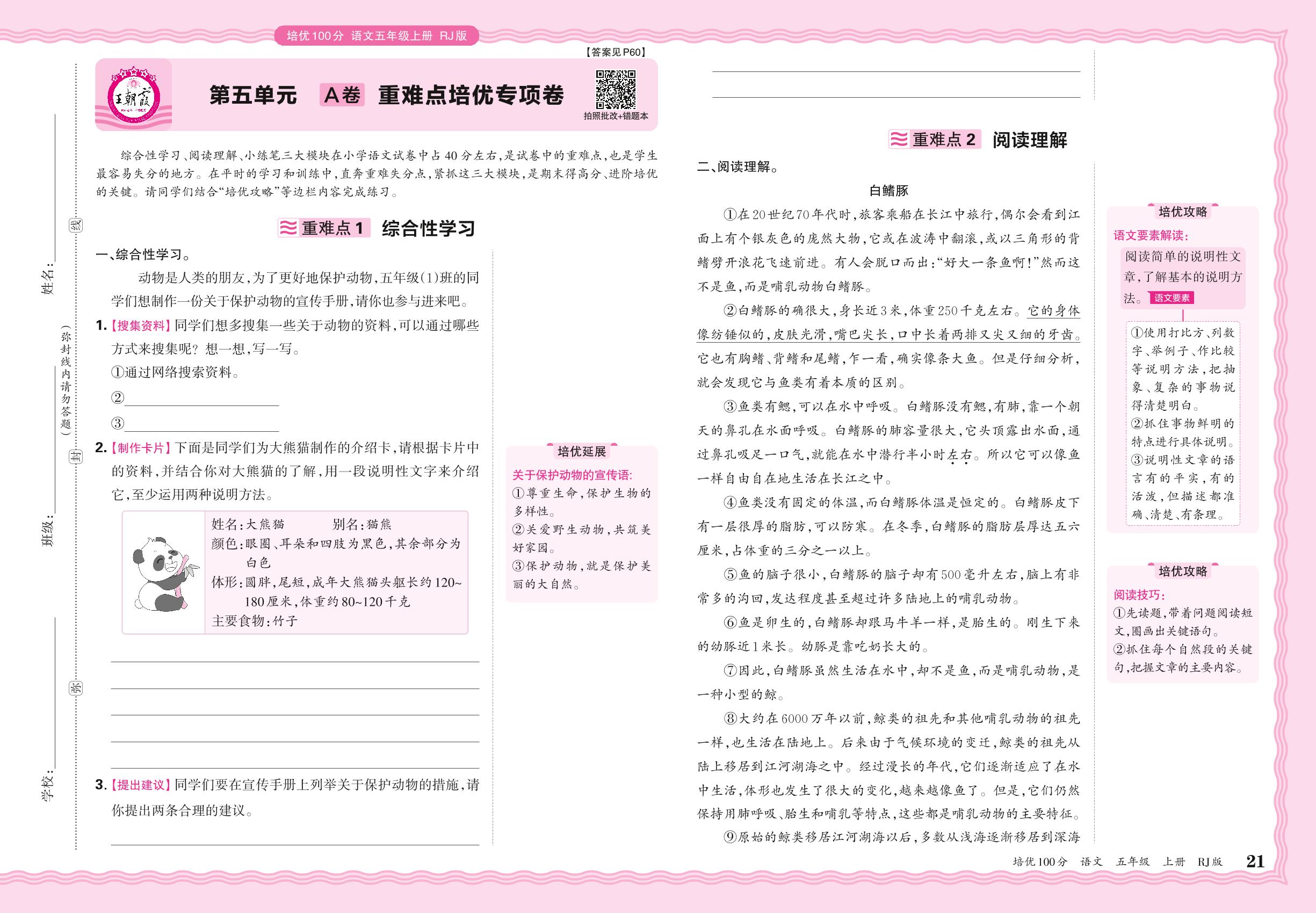 2024秋上册五年级语文人教版 第五单元A卷 重难点培优专项卷