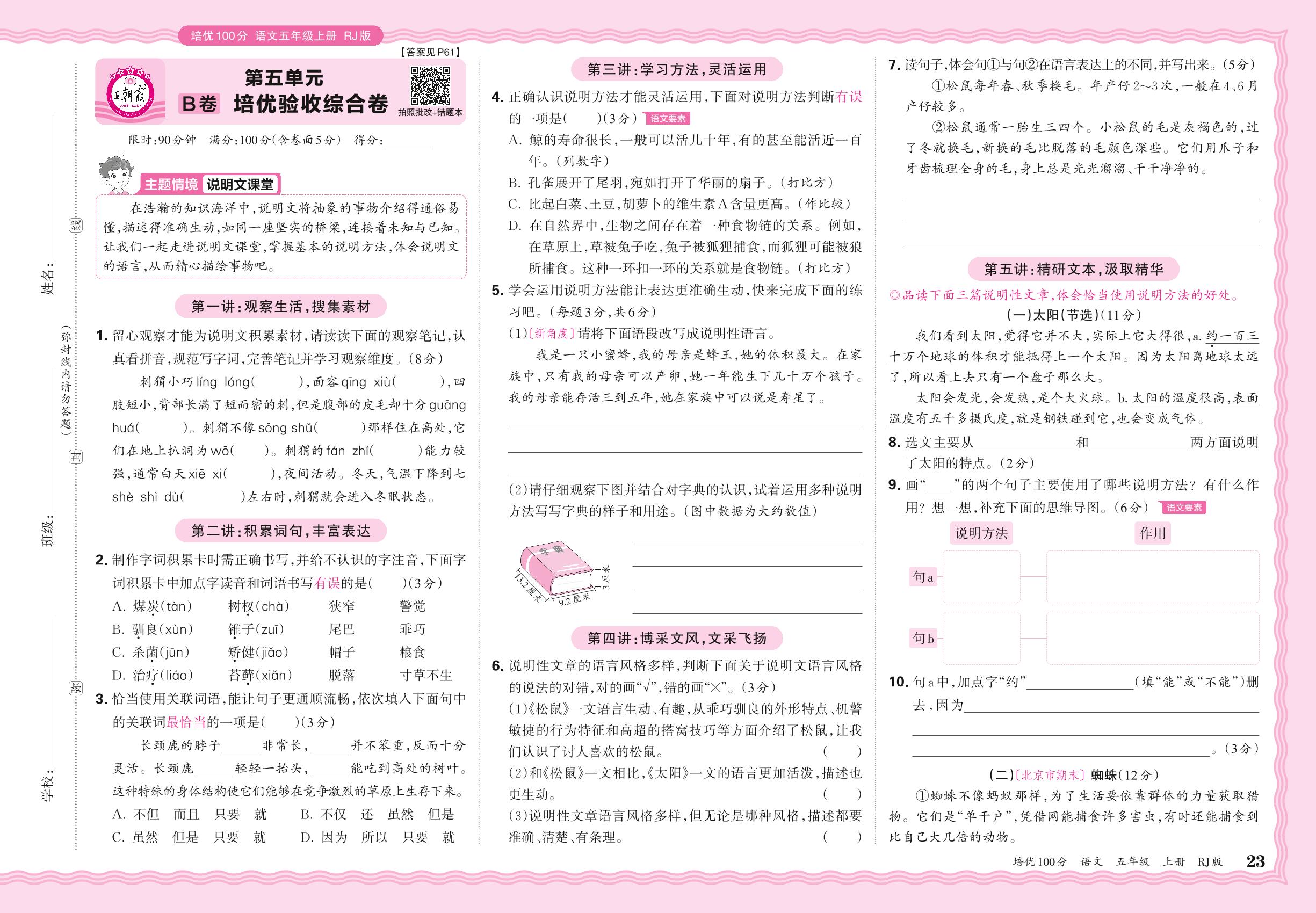 2024秋上册五年级语文人教版 第五单元B卷 培优验收综合卷