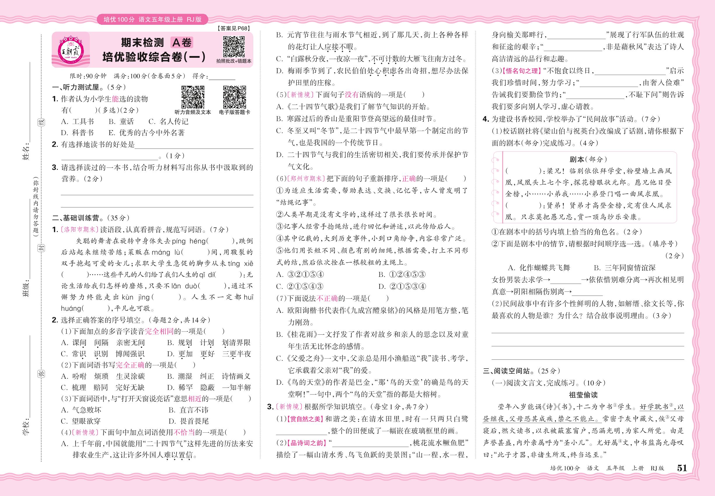 2024秋上册五年级语文人教版 期末检测A卷 培优验收综合卷(一)