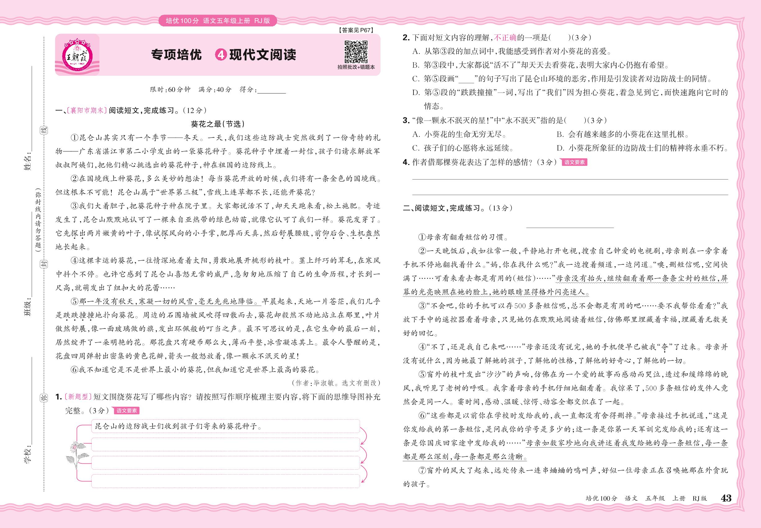 2024秋上册五年级语文人教版 期末专项卷PY版·现代文阅读【4】