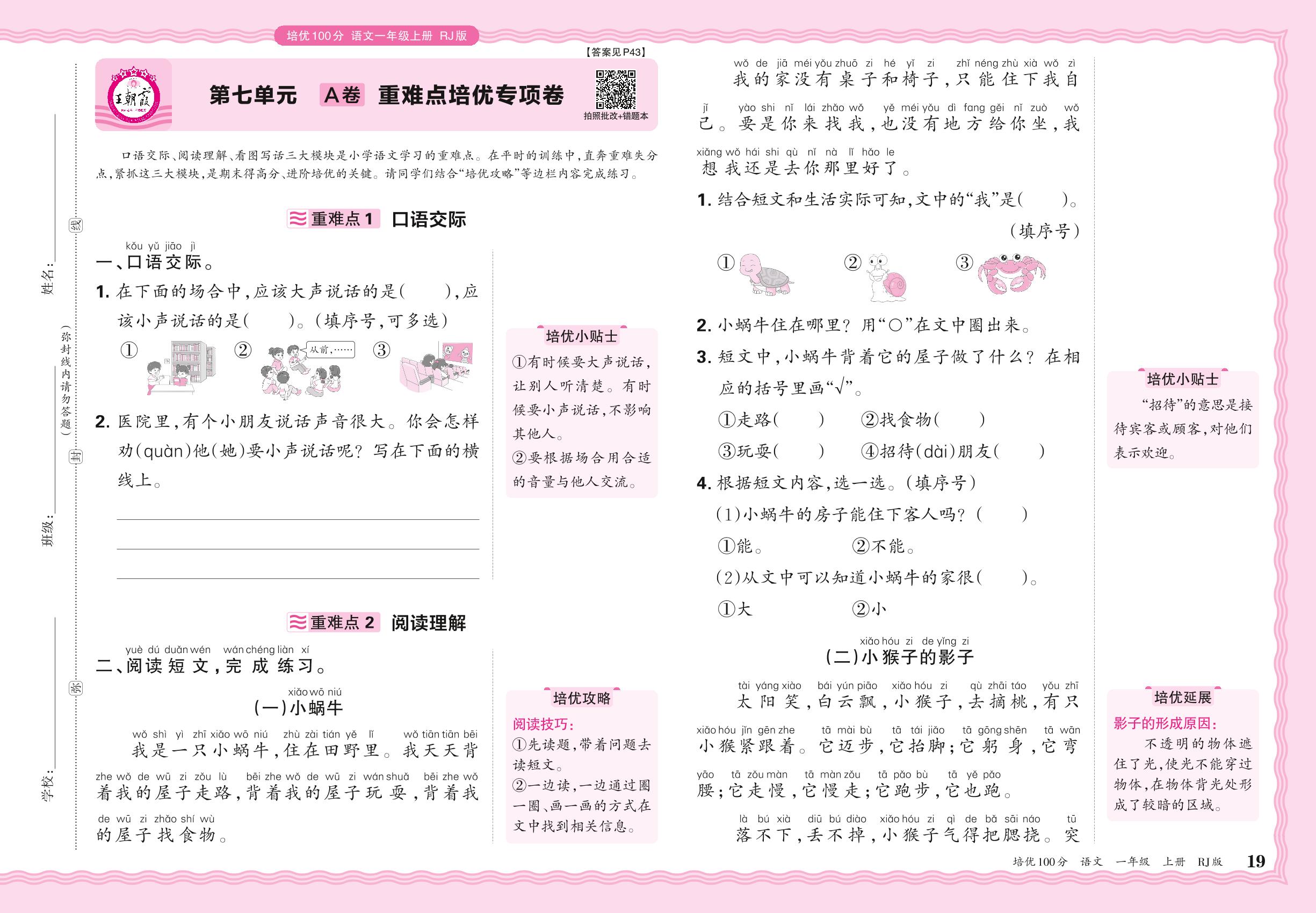 2024秋上册一年级语文人教版 第七单元A卷 重难点培优专项卷