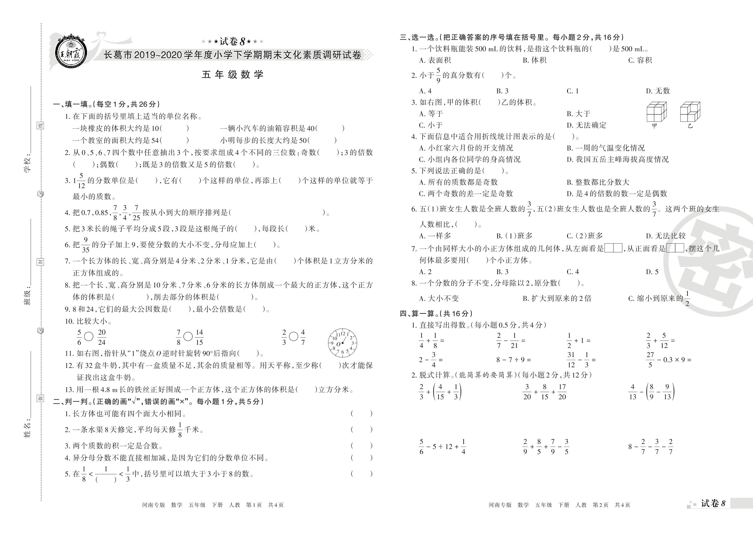 2019-2020学年第二学期长葛市五年级数学试卷(人教版)【8】