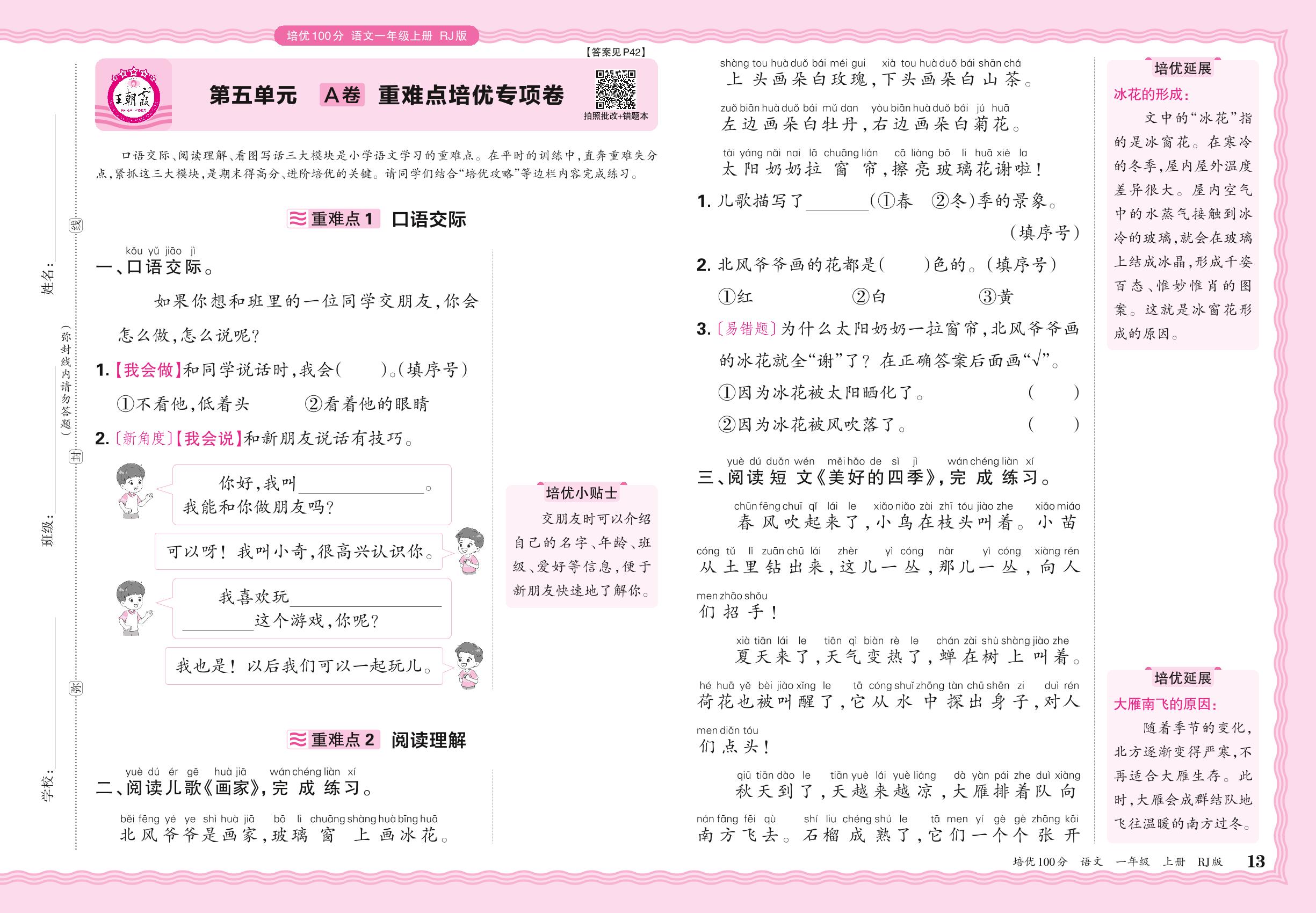 2024秋上册一年级语文人教版 第五单元A卷 重难点培优专项卷