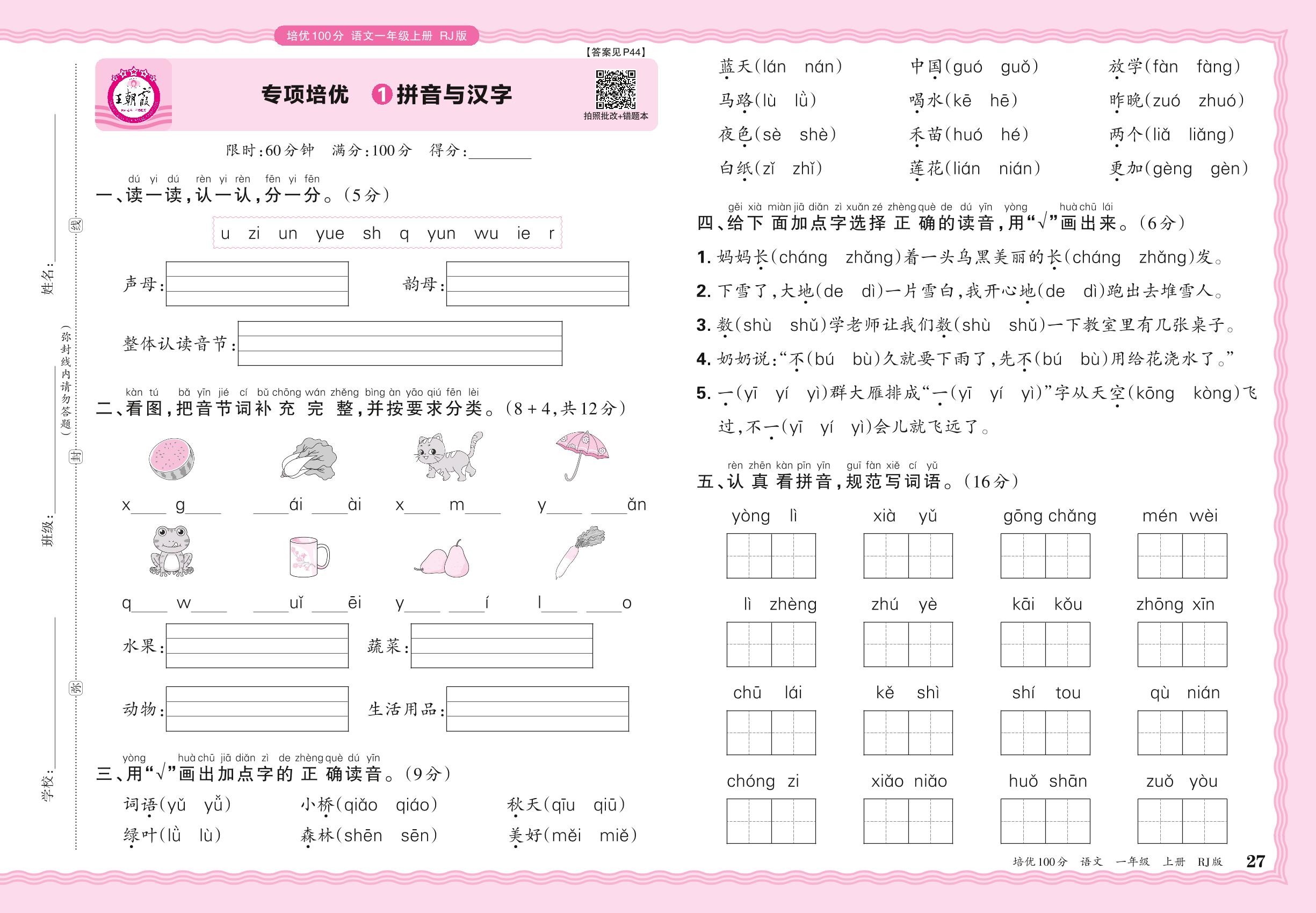 2024秋上册一年级语文人教版 期末专项卷PY版·拼音与汉字【1】