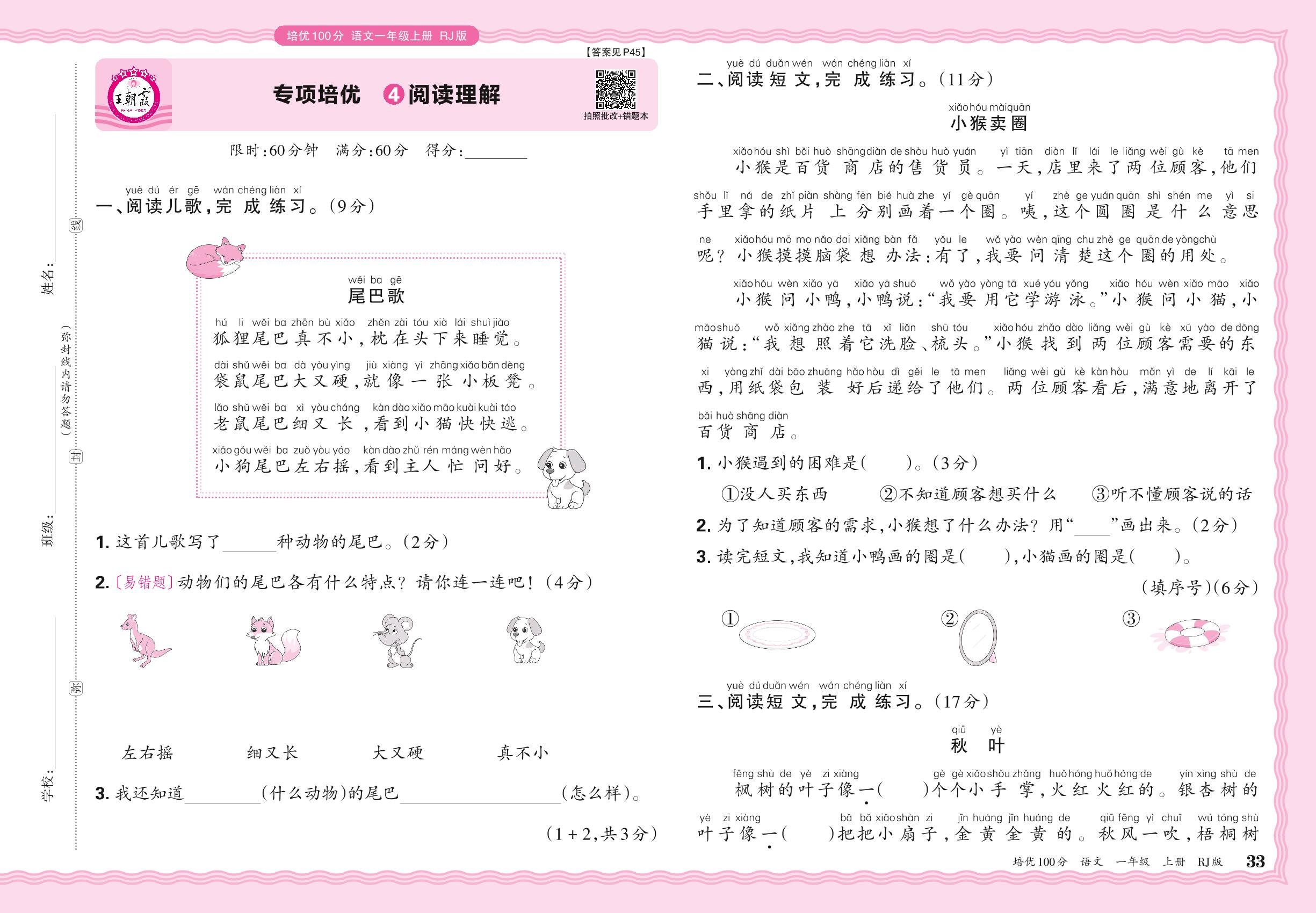 2024秋上册一年级语文人教版 期末专项卷PY版·阅读理解【4】