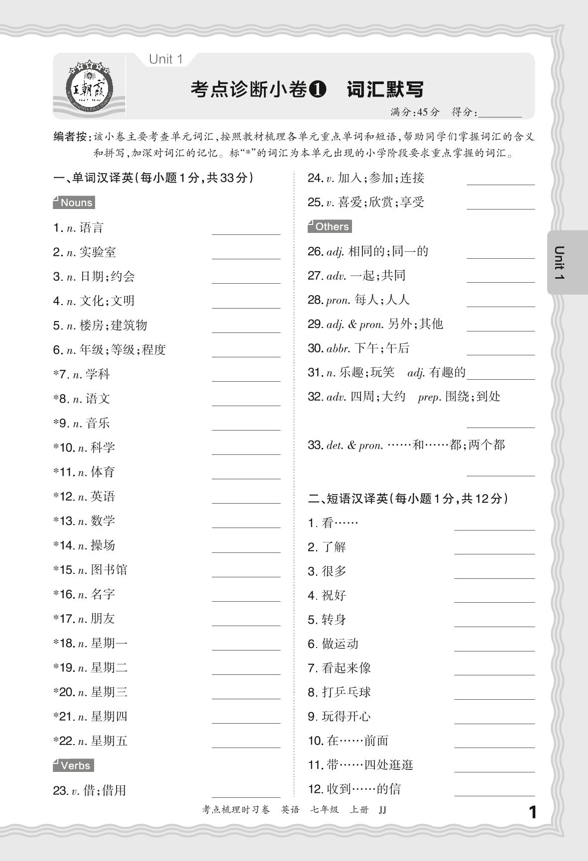 2024秋上册七年级英语冀教版 Unit 1 考点诊断小卷1 词汇默写