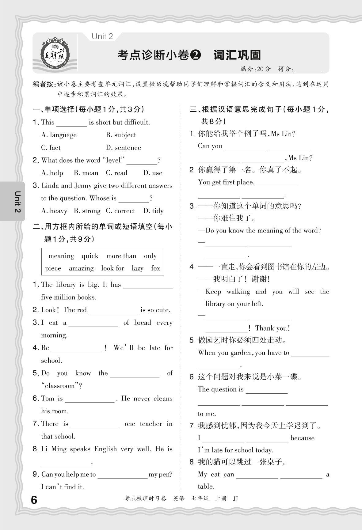 2024秋上册七年级英语冀教版 Unit 2 考点诊断小卷2 词汇巩固