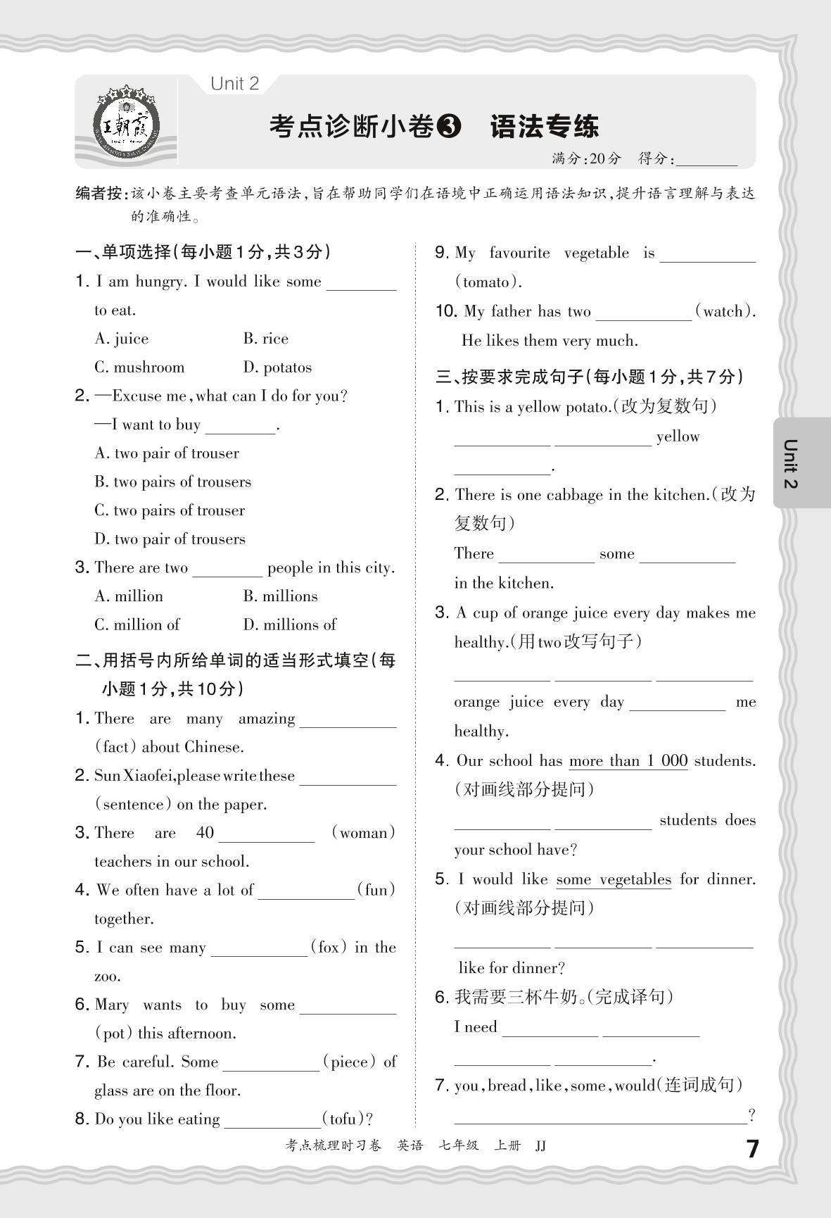 2024秋上册七年级英语冀教版 Unit 2 考点诊断小卷3 语法专练