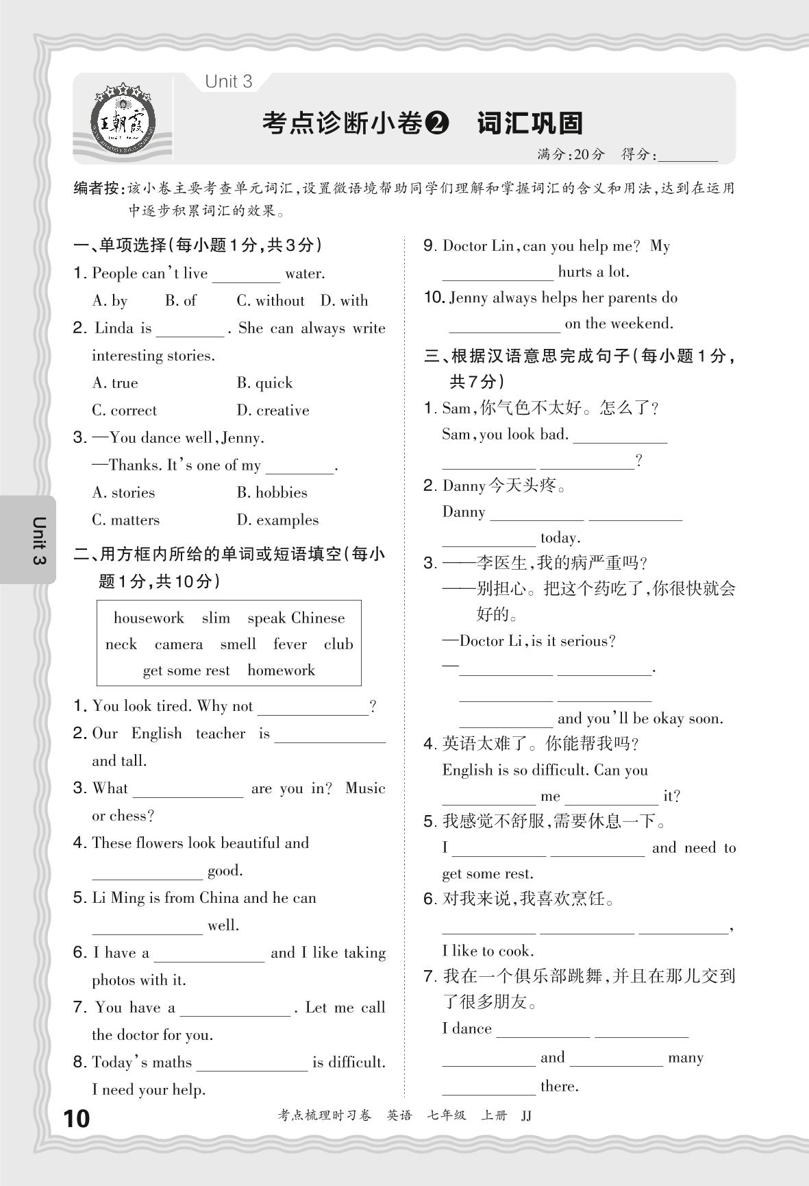 2024秋上册七年级英语冀教版 Unit 3 考点诊断小卷2 词汇巩固
