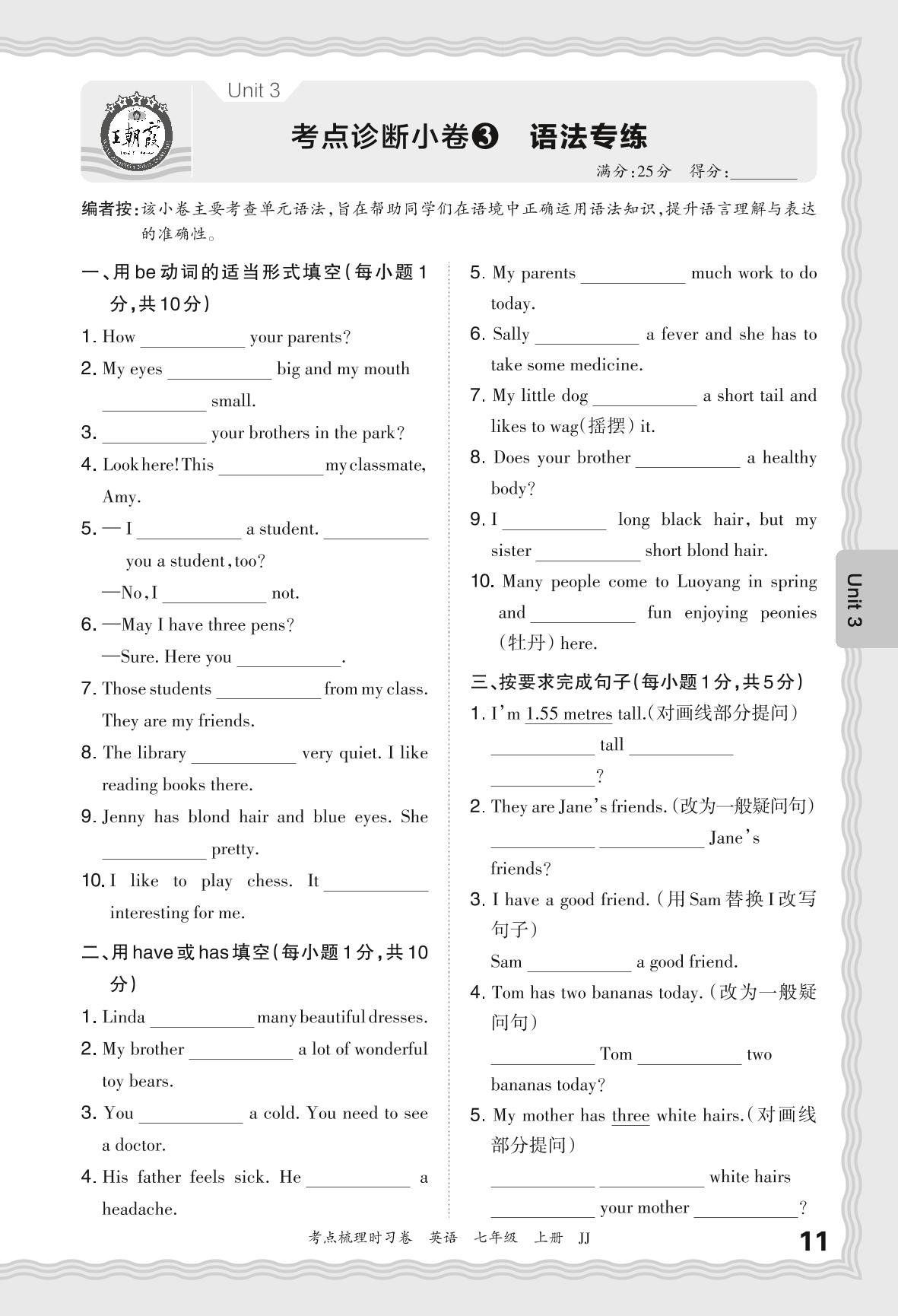 2024秋上册七年级英语冀教版 Unit 3 考点诊断小卷3 语法专练