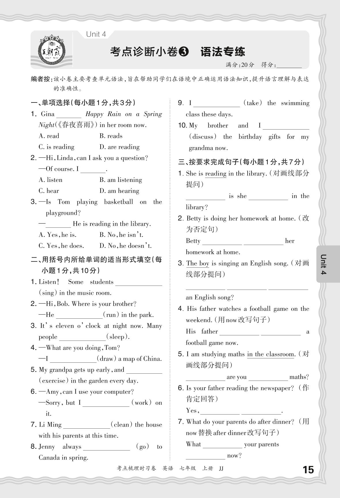 2024秋上册七年级英语冀教版 Unit 4 考点诊断小卷3 语法专练