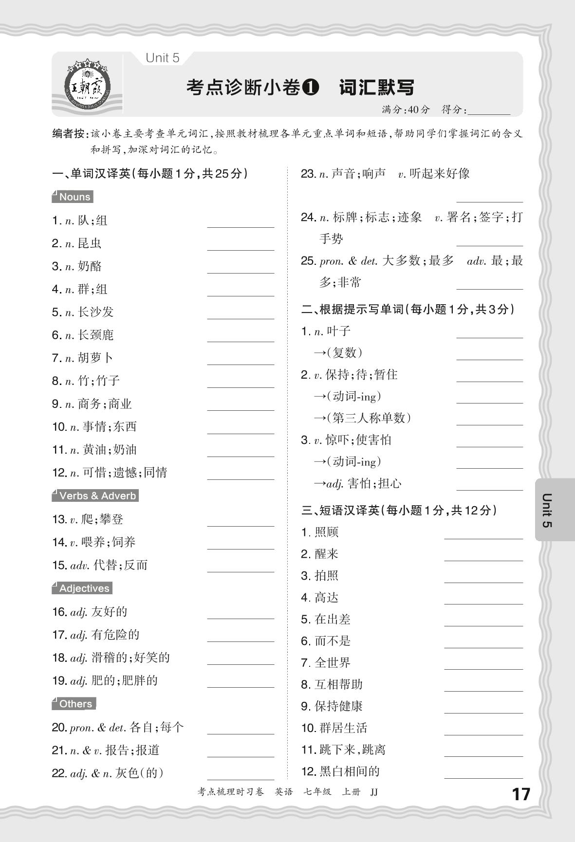 2024秋上册七年级英语冀教版 Unit 5 考点诊断小卷1 词汇默写