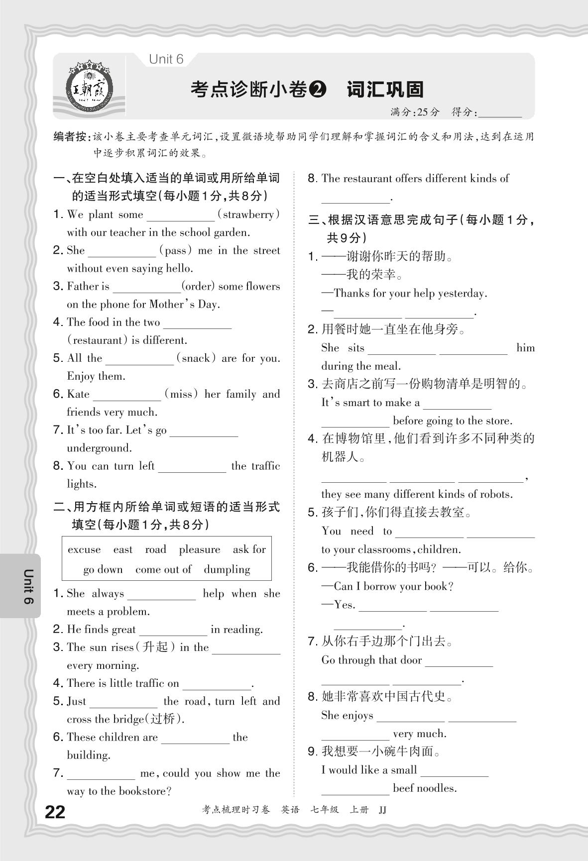2024秋上册七年级英语冀教版 Unit 6 考点诊断小卷2 词汇巩固