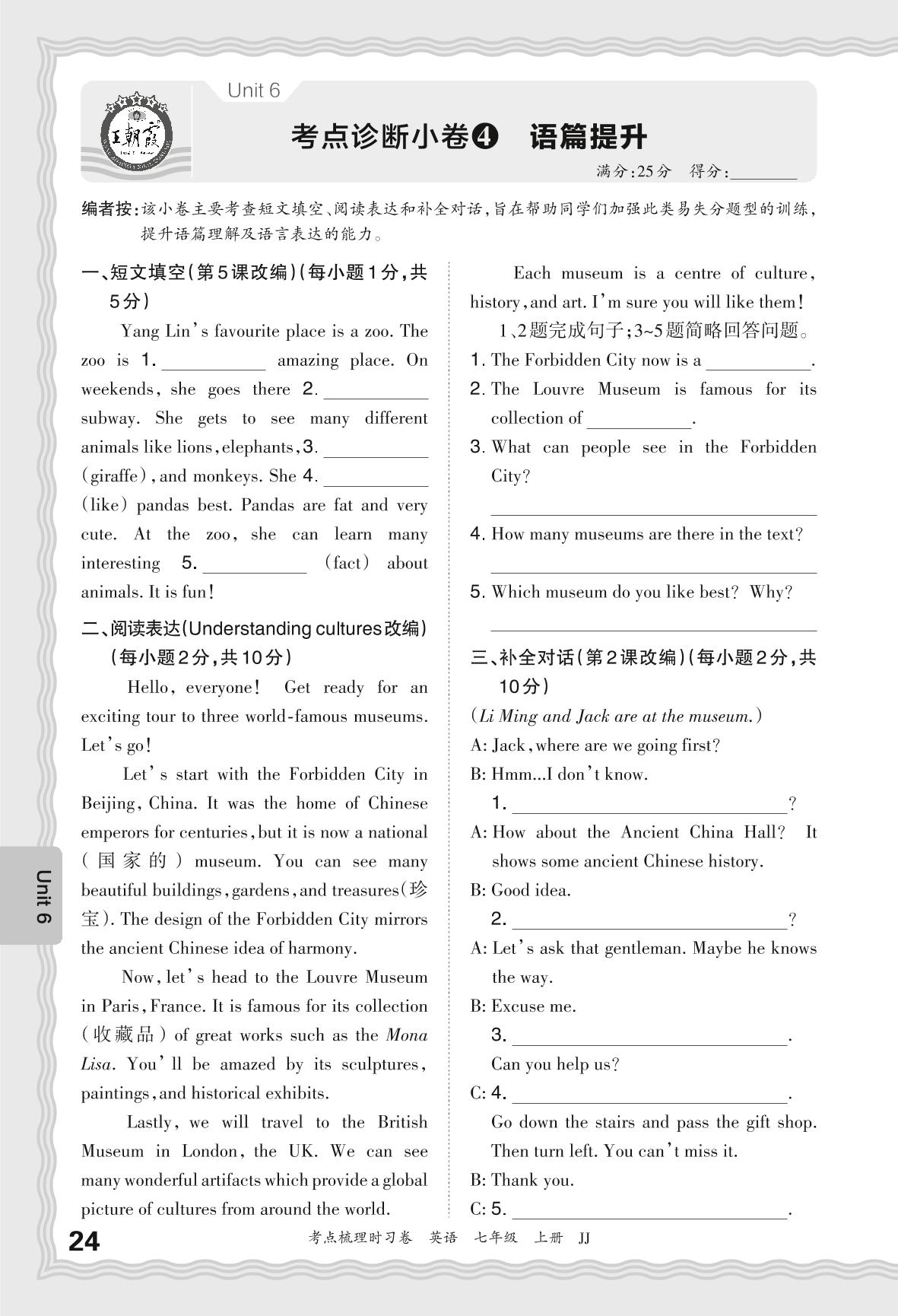 2024秋上册七年级英语冀教版 Unit 6 考点诊断小卷4 语篇提升