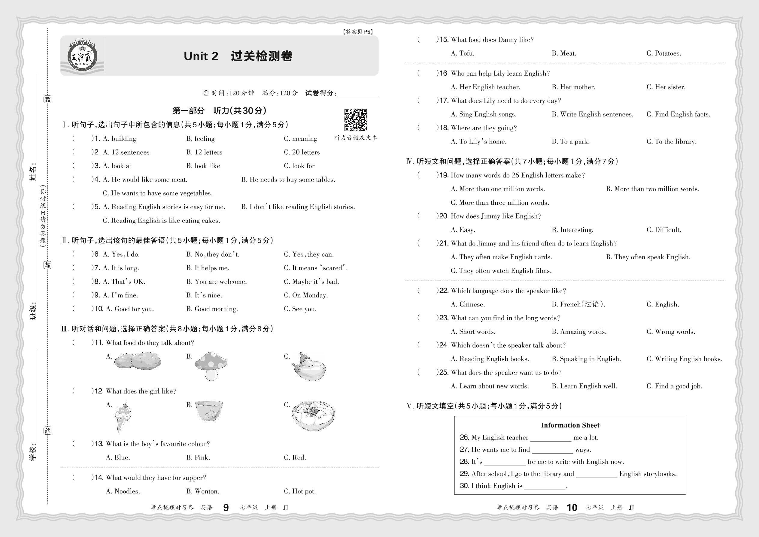 2024秋上册七年级英语冀教版 Unit 2 过关检测卷